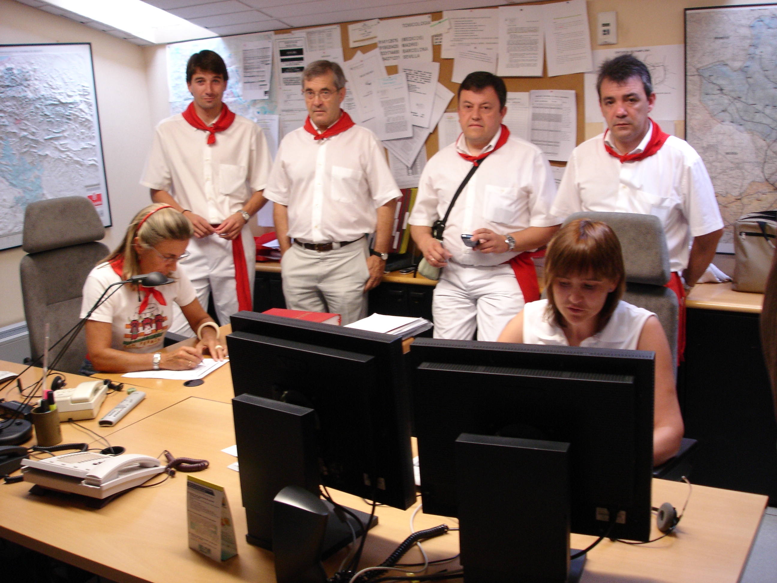 En esta visita, el consejero Caballero ha estado acompañado por el director gerente de la ANE-112, David Sáinz Jiménez, el director general de Interior, Juan Ramón Rábade Iráizoz, y el director de Protección Civil de la ANE-112, Alberto Otamendi Saldise. Durante la visita a las instalaciones de Sos Navarra, los altos cargos del departamento han podido comprobar cómo, desde una misma sala, las dos médicos de centro coordinador solicitaban información a los miembros de los órganos intervinientes en el encierro y tomaban decisiones sobre la atención sanitaria precisa en cada caso, con la colaboración estrecha del jefe de sala de Sos Navarra, de la DYA y de Cruz Roja presentes también en la sala de control.