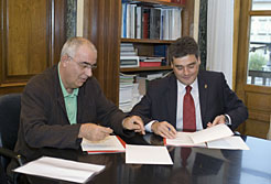 jueves, 14 de septiembre de 2006El consejero de Medio Ambiente, Ordenación del Territorio y Vivienda, José Andrés Burguete Torres, y el secretario general de la UGT, Juan Goyen Delgado, han firmado esta mañana un acuerdo por el que el Gobierno de Navarra enajenará a la entidad cooperativa de viviendas gestionada por la UTE Plazaola G.S.I. parcelas del Plan parcial Buztintxuri - Euntzetxiki - Santa Engracia, para construir 80 viviendas de protección general de régimen general.