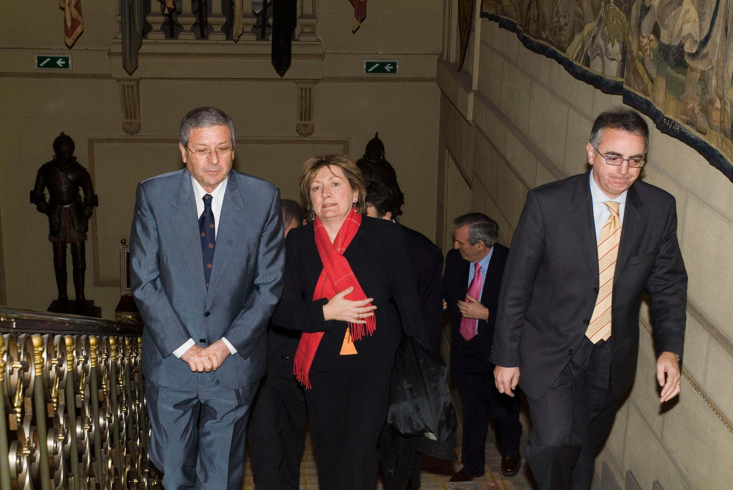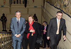La ministra, entre el consejero y el Presidente Sanz, a su llegada al Palacio de Navarra. ( ampliar imagen )