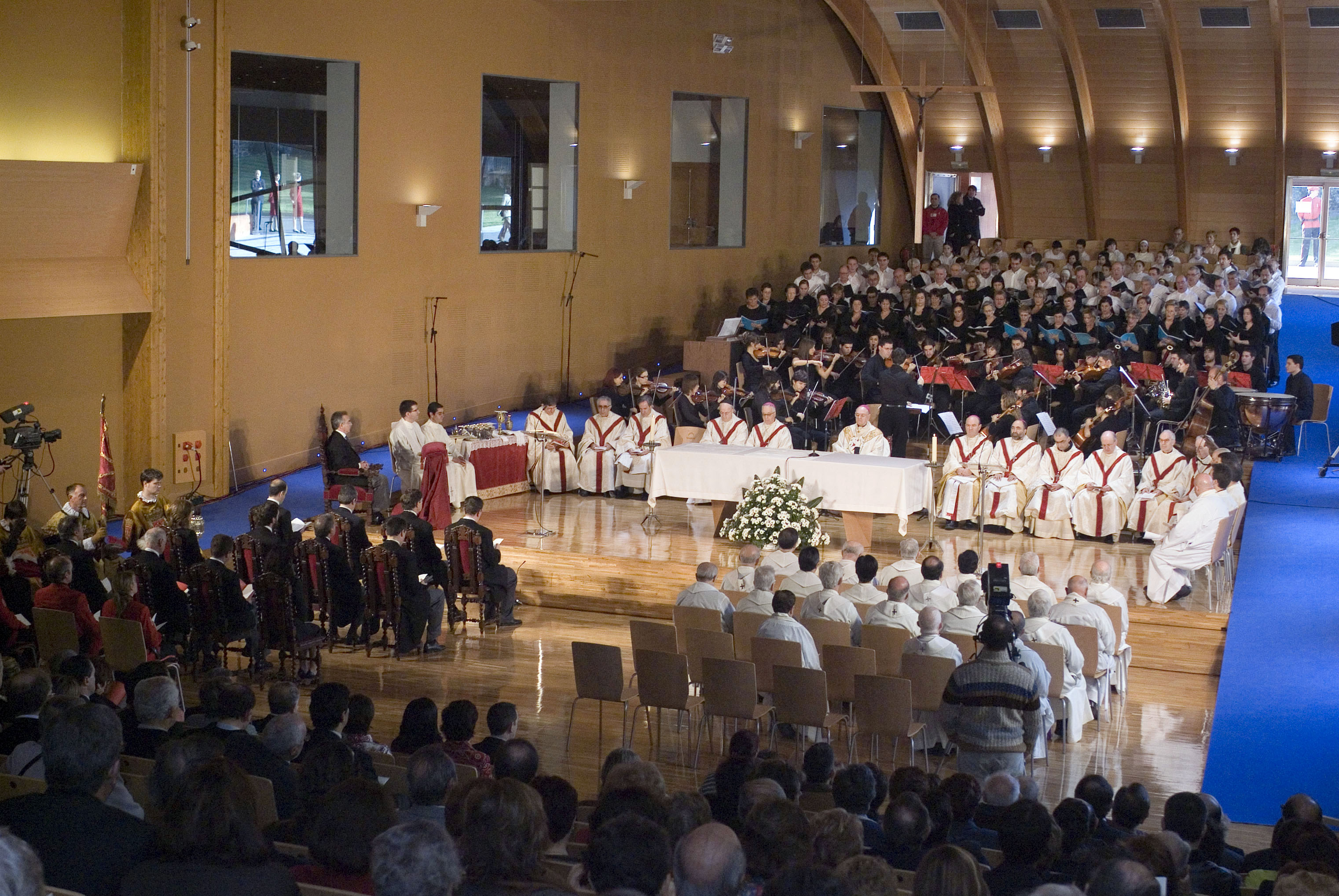 De acuerdo con lo previsto, poco ante de las once de la mañana se ha formado el tradicional cortejo compuesto por el Presidente y los consejeros del Gobierno de Navarra, y el Presidente del Parlamento de Navarra, que han desfilado tras el Rey de Armas y los Maceros. A los acordes del Himno de Navarra (“Marcha para la entrada del Reino, del siglo XVIII), la comitiva oficial ha accedido al Aula Francisco de Jasso, donde se ha celebrado una Misa, presidida por el arzobispo de Pamplona y obispo de Tudela, Fernando Sebastián Aguilar, con quien han concelebrado el arzobispo de Zaragoza -Manuel Ureña-, el obispo de Huesca y Jaca -Jesús Sanz- el obispo navarro en Aguerico (Ecuador), el capuchino Jesús Esteban Sádaba, y los abades de Leyre y La Oliva -Luis Pérez u Pablo Gordillo, respectivamente-. Al comienzo del acto religioso ha saludado a los fieles presentes Juan Manuel Arregui, S.J., responsable de la Provincia de Loyola de la Compañía de Jesús.