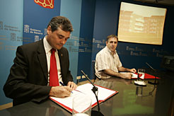 El consejero de Medio Ambiente, Ordenación del Territorio y Vivienda, José Andrés Burguete Torres, y el alcalde de Berrioplano, José María Irisarri Ollacarizqueta, han firmado esta mañana un Convenio de Colaboración para la promoción de 64 viviendas de protección oficial de régimen general en dicho municipio.