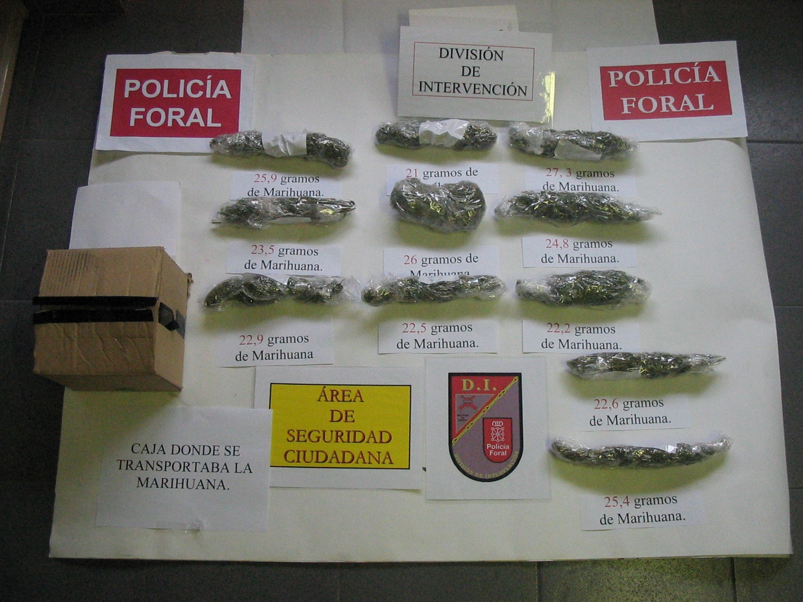 La actuación tuvo lugar en torno a las 13 horas, en el transcurso de un control preventivo situado en la carretera PA-30 (Ronda de Pamplona) en el kilómetro 1,1 en las cercanías del Polígono de Landaben. Los agentes pararon para el control a una furgoneta en cuyo interior localizaron una caja con los paquetes de marihuna.