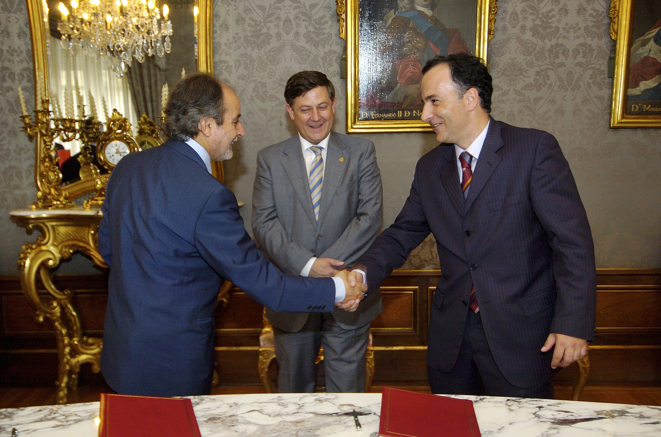Luis Pedroche y José Ignacio Pérez de Albéniz se estrechan la mano después de la firma ante la mirada del consejero de Economía y Hacienda, Francisco Iribarren.