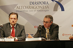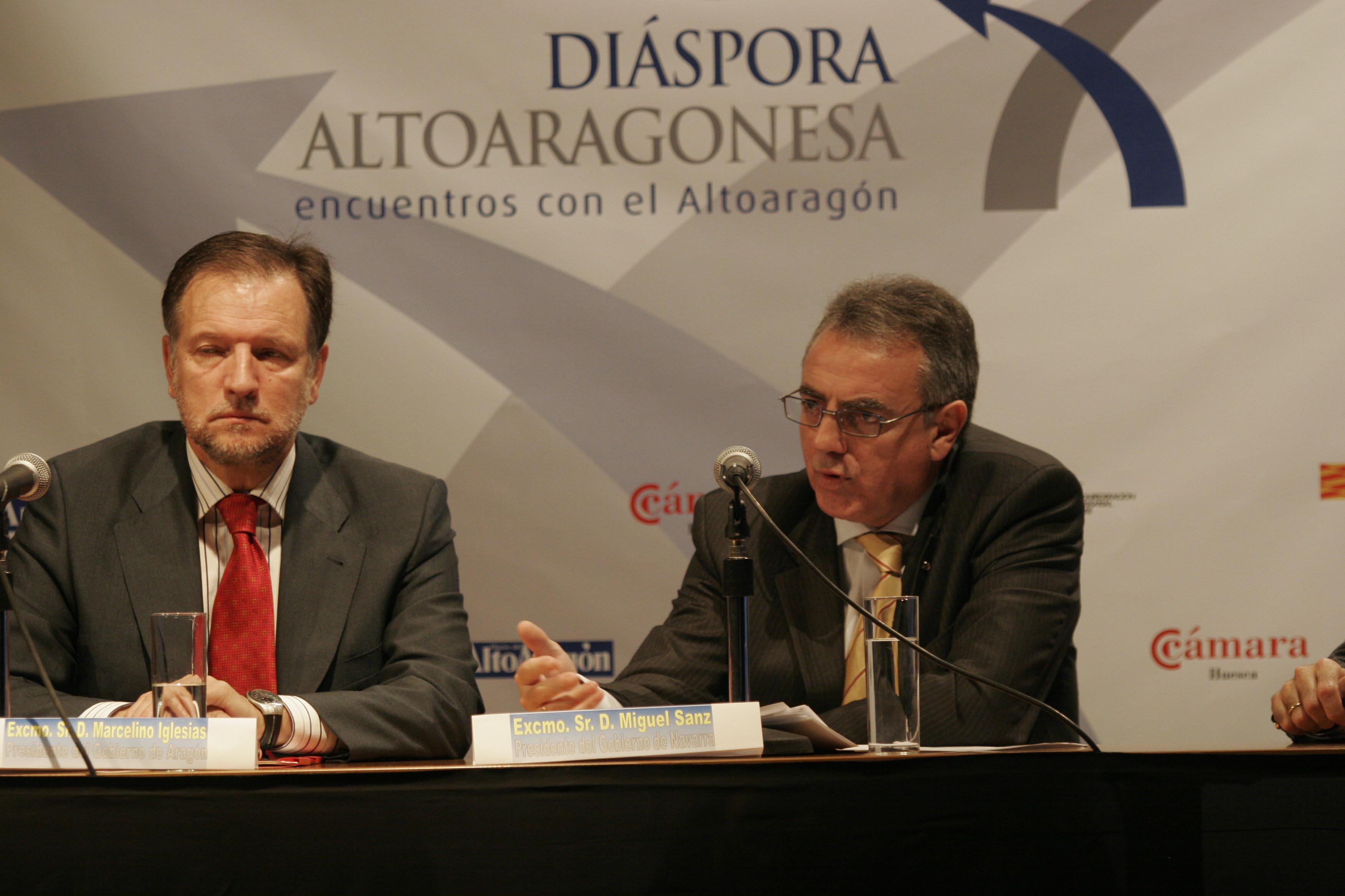 La intervención del Presidente Sanz, que tuvo lugar dentro de una jornada promovida por la Cámara de Comercio de Huesca, a través de FUNDESA y por el diario El Alto Aragón, con el fin de exponer la realidad socioeconómica de la Comunidad Foral y analizar algunos problemas e inquietudes comunes de Navarra y de Aragón. Le acompañó el Presidente del Gobierno de Aragón, Marcelino Iglesias. Previamente a la conferencia del Presidente Sanz, que tuvo lugar en el centro cultural “El Matadero” de la capital oscense, los consejeros del Gobierno de Navarra, Alvaro Miranda y José Javier Armendáriz participaron en una mesa redonda en la que explicaron las líneas maestras de sus departamentos en los ámbitos económico y social.