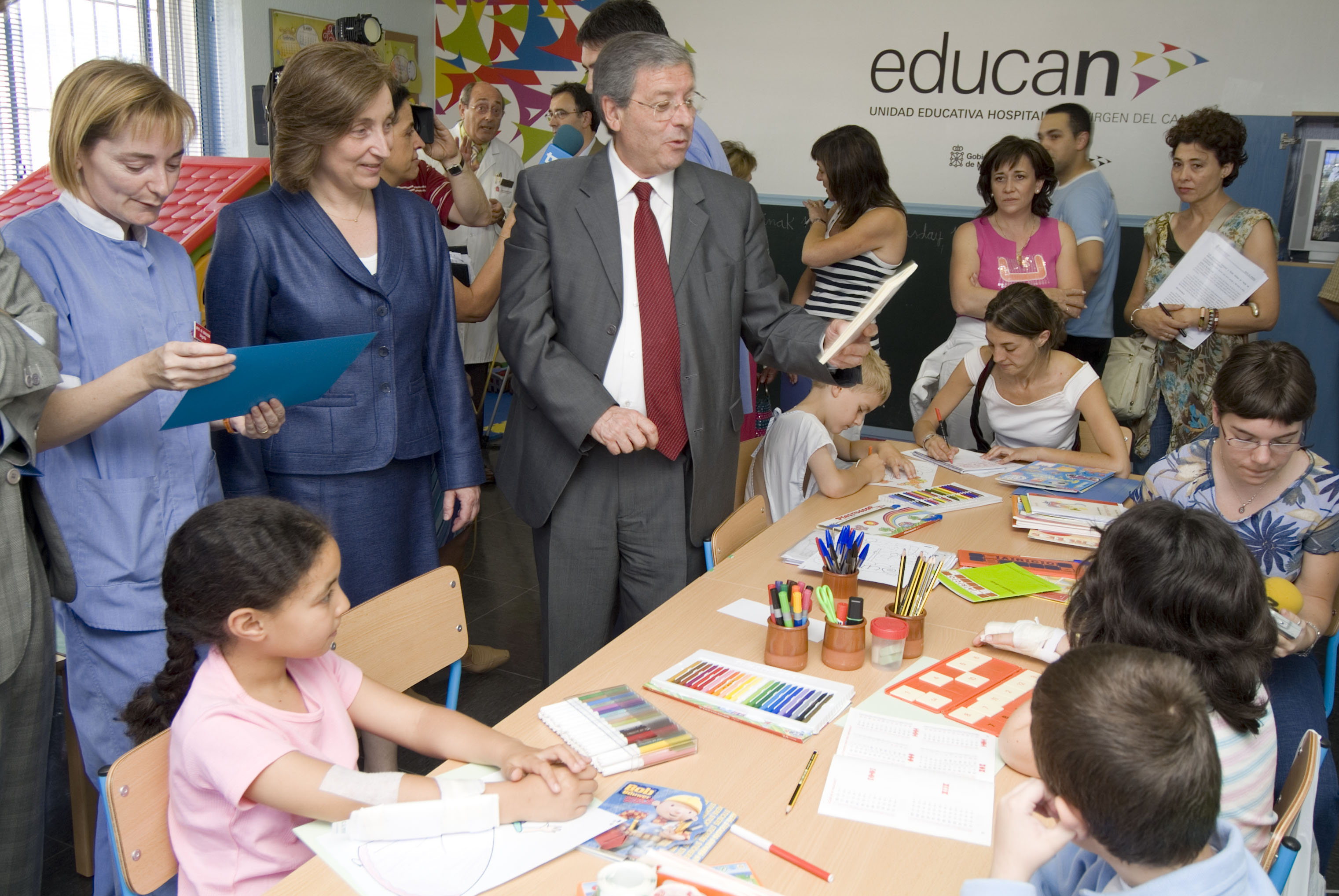 Los Consejeros del Gobierno de Navarra de Salud, Maria Kutz, y Educación, Luis Campoy, acompañados del gerente de la Fundación Caja Navarra, Guillermo Catalán, han visitado esta mañana el aula de atención educativa hospitalaria, ubicada en la 4ª planta del Hospital Materno Infantil Virgen del Camino. Al inicio del presente curso escolar ambos departamentos del Gobierno y la Fundación Caja Navarra suscribieron un convenio de colaboración para el desarrollo de "Educan", Programa de Atención Educativa Hospitalaria y de Atención Educativa Domiciliaria, dirigido al alumnado de 3 a 15 años que no puede acudir a los centros escolares por motivo de una hospitalización prolongada.