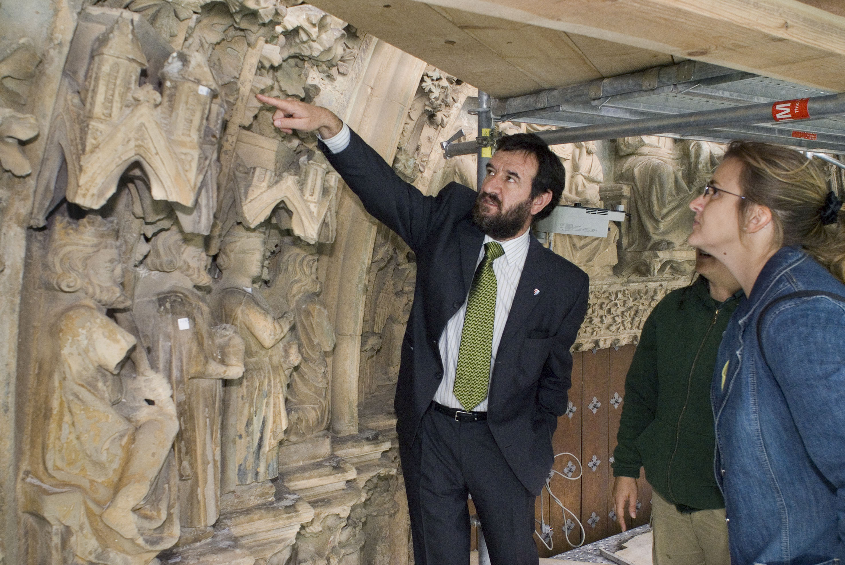 El consejero de Cultura y Turismo del Gobierno de Navarra, Juan Ramón Corpas Mauleón, ha asistido esta mañana a los trabajos de retirada de la estatua de Doña Blanca de Santa María de Olite para su tratamiento, y ha sido informado por los técnicos del Servicio de Patrimonio Histórico y de la empresa que está llevando a cabo el estudio de la portada de la iglesia, que hoy estaba analizando microscópicamente la piedra.