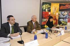 Un momento de la rueda de prensa. De izda a dcha, Iñaki Goñi, el consejero Echarte, e Itziar Inza. (ampliar imagen)