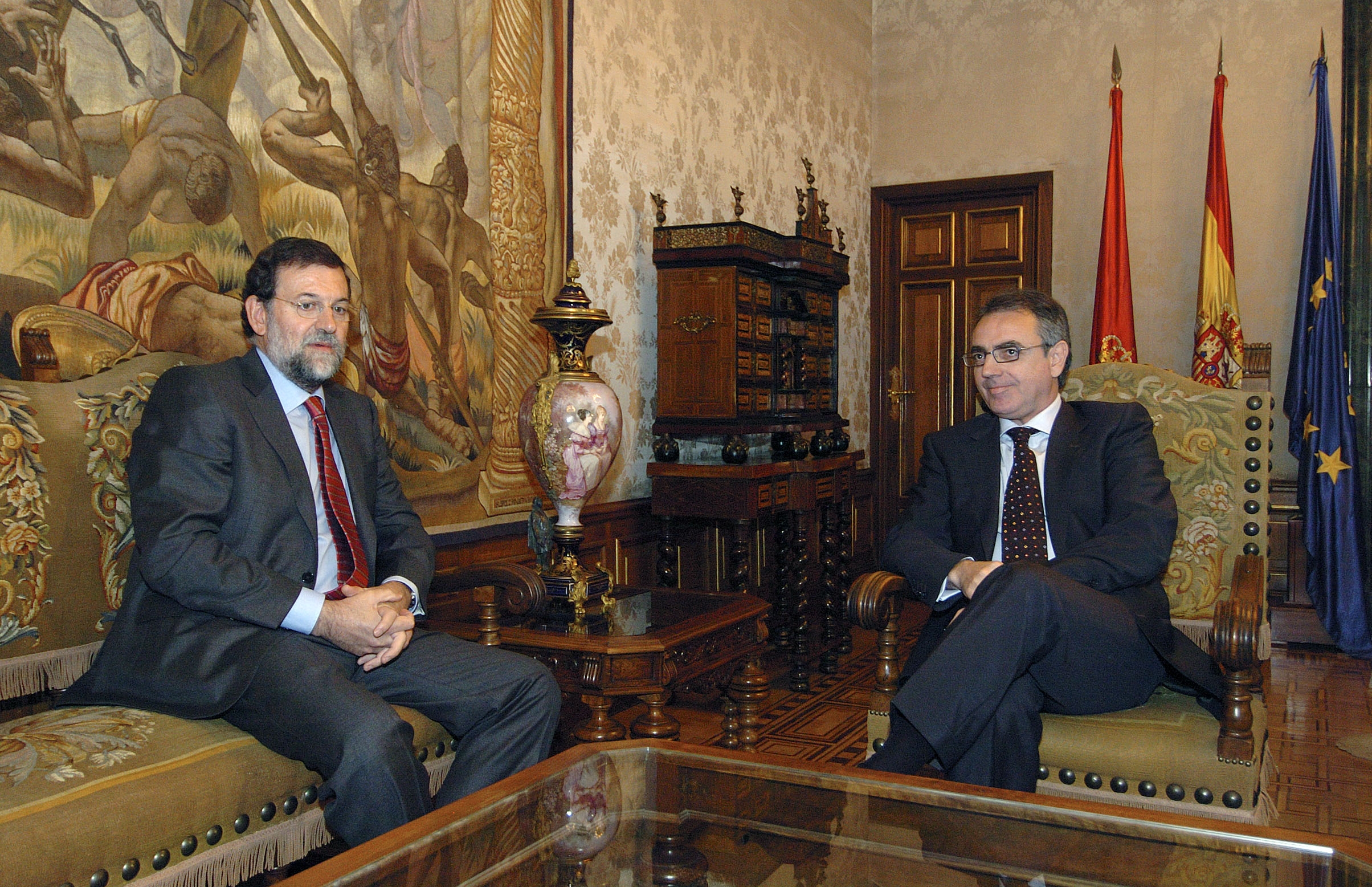 El Presidente Sanz ha recibido hoy al mediodía en el Palacio de Navarra a Mariano Rajoy, con quien ha contrastado las opiniones sobre la actual situación política derivada del denominado proceso de paz. En este aspecto, ambos líderes han coincidido en el diagnóstico de la tesitura política así como en la necesidad de salvaguardar a Navarra como Comunidad diferenciada.