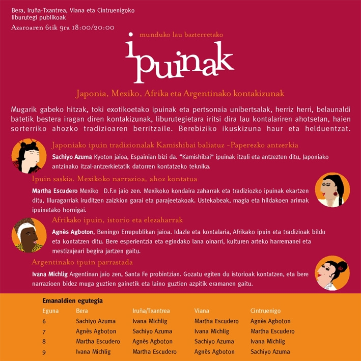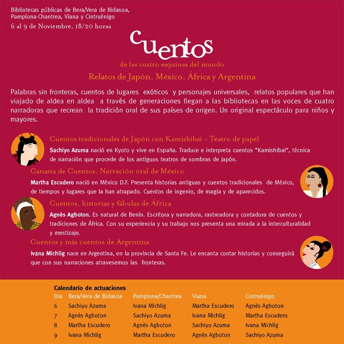 Las bibliotecas públicas de Bera/Vera de Bidasoa, Pamplona-Chantrea, Viana y Cintruénigo acogerán entre los días 6 y 9 de noviembre audiciones de cuentos de Japón, México, África y Argentina, a cargo de cuatro narradores.