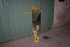 Imagen de la puerta forzada por los ladrones que fueron detenidos para lograr entrar en la empresa de Mutilva Alta objeto del robo.(ampliar imagen)