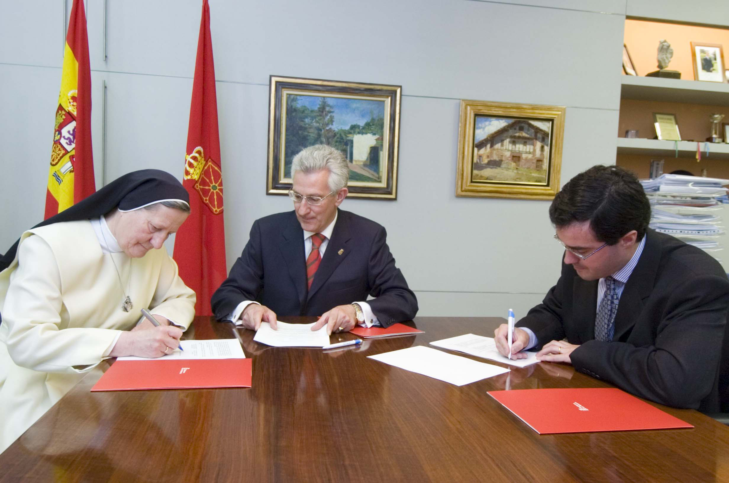 El director gerente del Instituto Navarro de Bienestar Social (INBS), Nicolás Iribas Sánchez de Boado, e Isabel Pedrera Chaves, en representación de la Congregación Esclavas de la Virgen Dolorosa, han firmado esta mañana un acuerdo por el cual el INBS aporta una subvención de 711.294 € para la financiación del programa que integra la Residencia Javier, en el acogimiento, en régimen de internado, a mujeres con discapacidad intelectual.