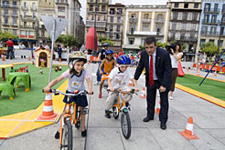 El Consejero Caballero acompaña en su aprendizaje de conducción a varios niños que esta mañana se han acercado al parque vial infantil de la Plaza del Castillo.