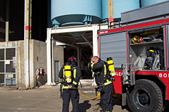 Dos bomberos, en un momento de la visita de prevención realizada a la empresa V. Luzuriaga. ( ampliar imagen )