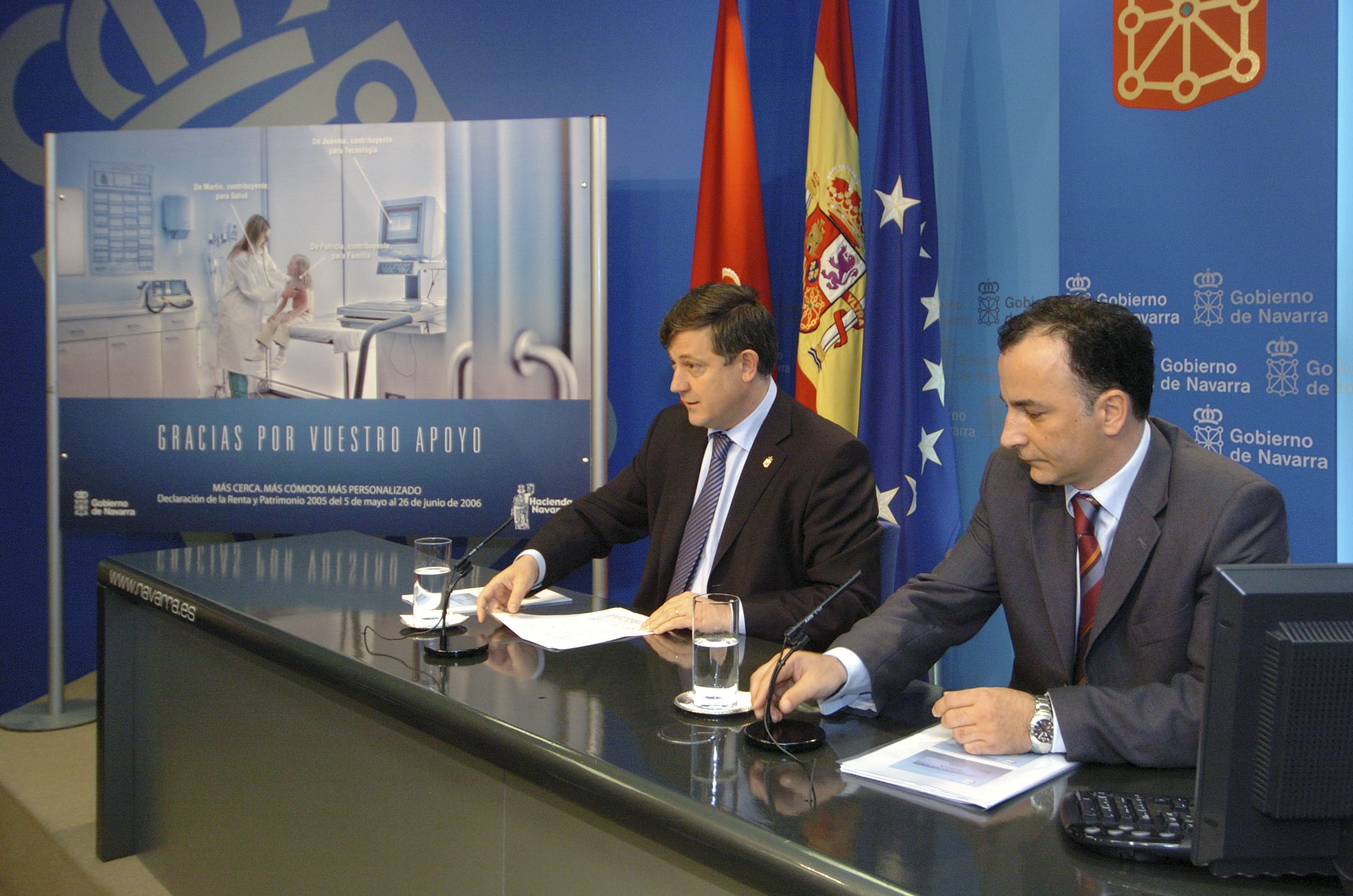 El consejero de Economía y Hacienda, Francisco Iribarren, y el director de Hacienda Tributaria, José Ignacio Pérez de Albéniz, presentan la campaña de la Renta 2005