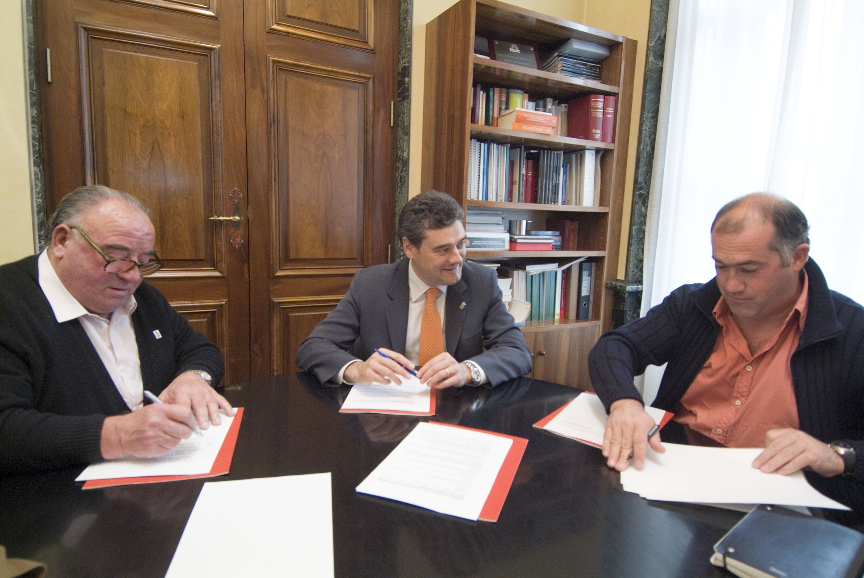 Imagen de la firma del convenio. De izquierda a derecha: Conrado Orduna, el consejero Burguete y Ángel Luis de Miguel. ( ampliar imagen )