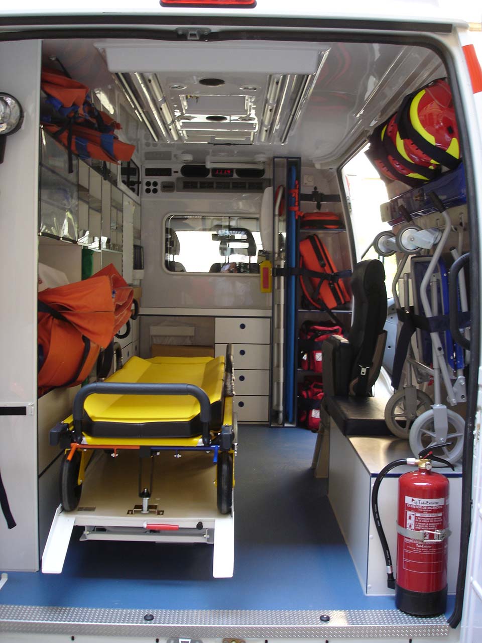 Las ambulancias también han sido dotadas de los aparatos electromédicos de última generación: desfibrilador, respiradores en techo, tensiómetro y pulsioxímetro digital fijo y otro portátil, calientasueros portátil, aspirador de líquidos…