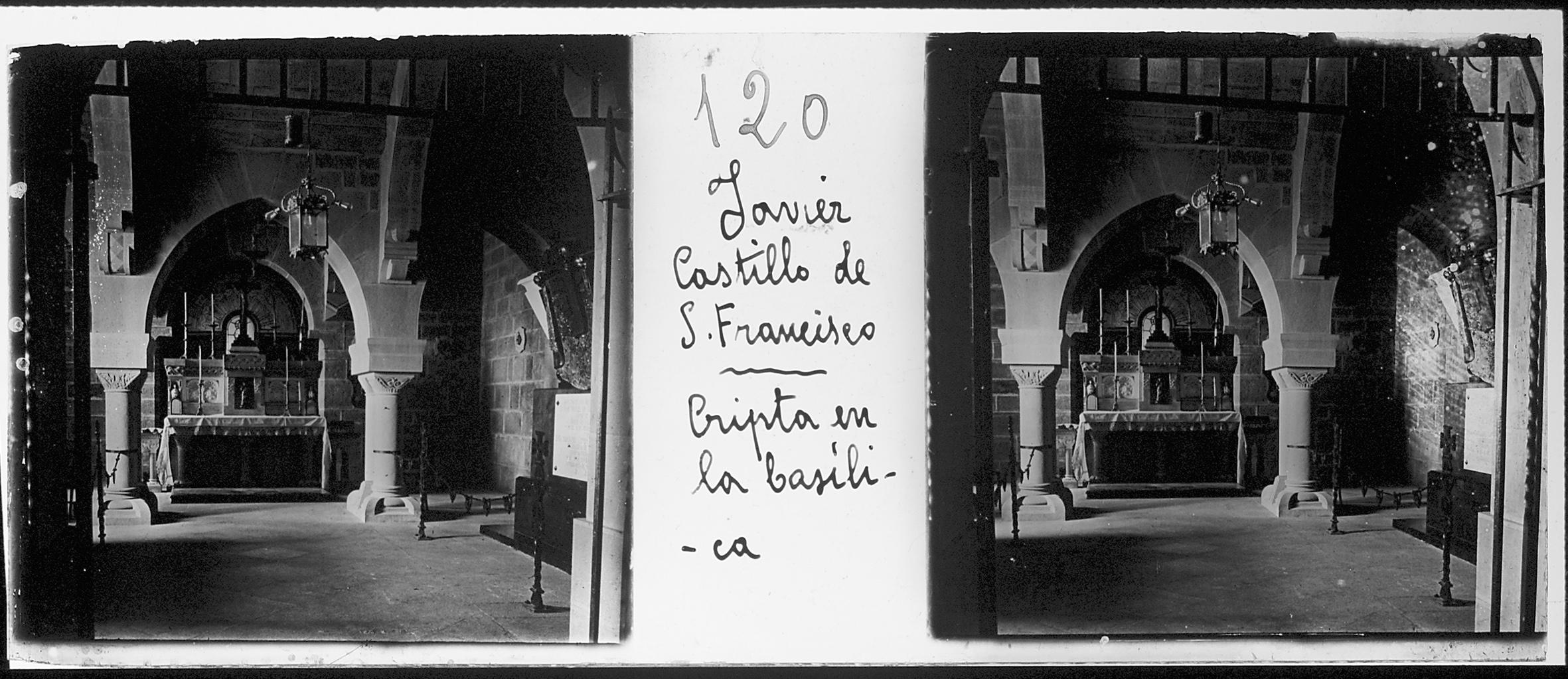 La fotografía forma parte de una colección encargada para su exhibición en el pabellón de Navarra de la Exposición Iberoamericana celebrada en Sevilla en 1929. La cripta acoge el sepulcro de María del Carmen Azlor de Aragón e Idiáquez, duquesa de Villahermosa, de su esposo José Manuel de Goyeneche y Gamio, conde de Guaqui, y otros familiares que favorecieron la restauración del castillo y la construcción de la basílica.