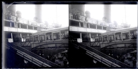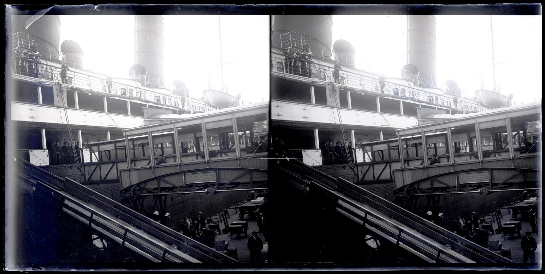Vista parcial de un barco trasatlántico atracado en el puerto de Liverpool, Reino Unido, acoplando la pasarela de desembarque. En primer término, una pasarela. En segundo plano, la estructura de desembarque con el letrero: MENSEY DOCKS AND HARBOUR BOARD / NOTICE TO CARTERS. LOADS TO PASS / UNDER THIS GANGWAY. MUST NOT EXCEED / () OF 19 INCHES IN HEIGHT, AND MUST BE KEPT / CLEAR OF THE CHAIN WHEELS AT THE SIDES. En segundo plano, el barco y un grupo de personas esperando al acople de la estructura.