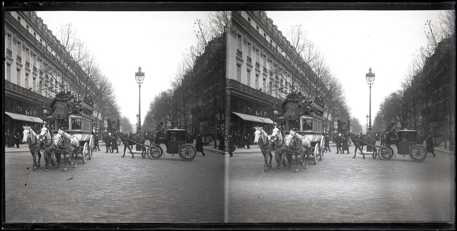 • Contenido: Vista del boulevard de las Capuchinas de París. En primer término, un coche de línea con el número 1392 tirado por 3 caballos y otros carruajes. En la derecha, un quisco con publicidad de "Chocolat Mnier"