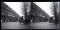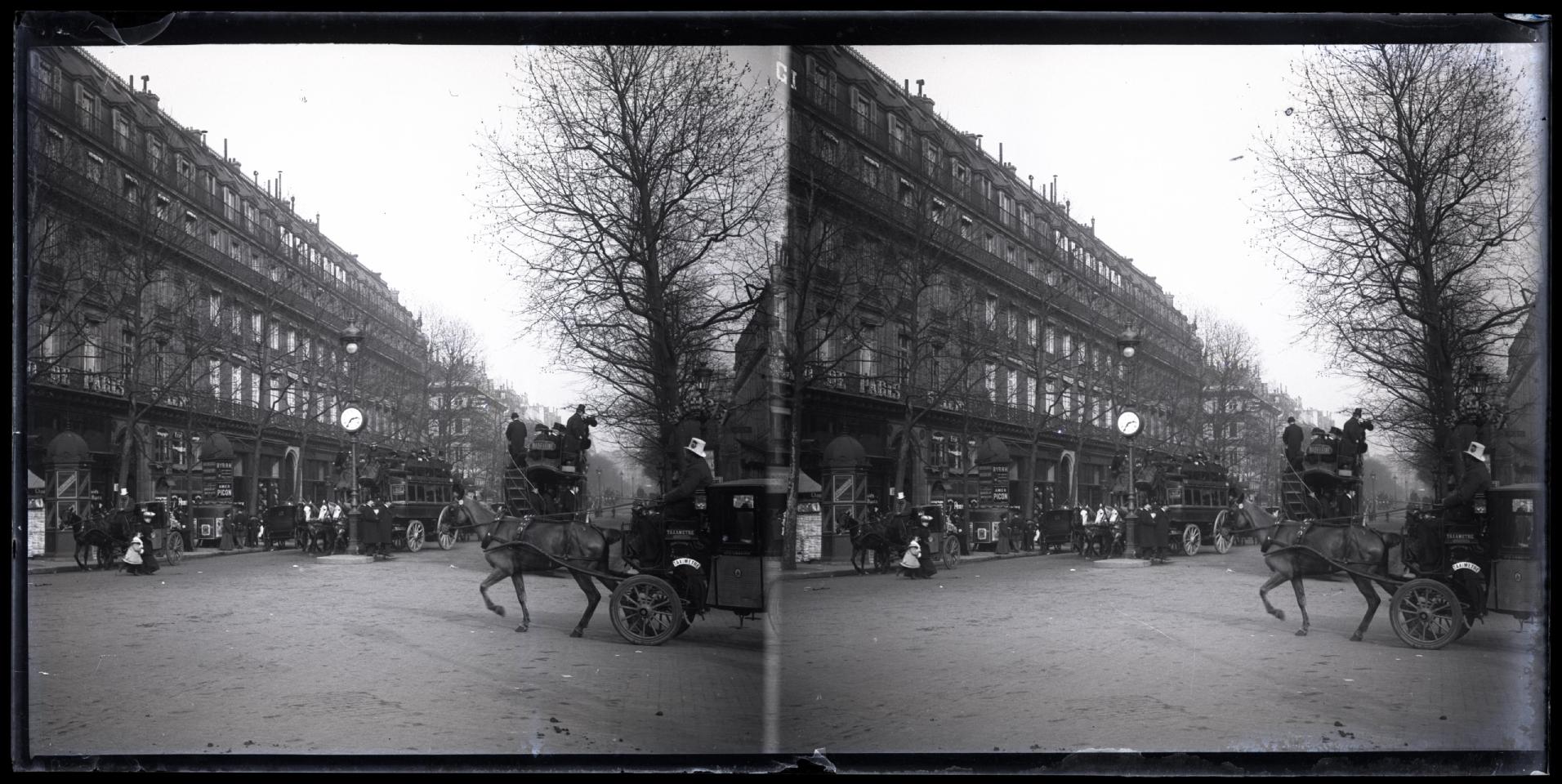 • Contenido: Vista del boulevard de las Capuchinas de París. En primer término, la calzada, una farola con reloj y carruajes tirados por caballos. Uno de los carruajes, de transporte público tiene los letreros de TAXIMETRE y TAXAMETRE / COMPAGNIE L'UR(...)NE; otro ,de pasajeros, tiene el rótulo MADELEINE - BASTILLE y un tercero, en sentido contrario, MADELEINE. En la acera, los viandantes junto a las fachadas con comercios.