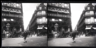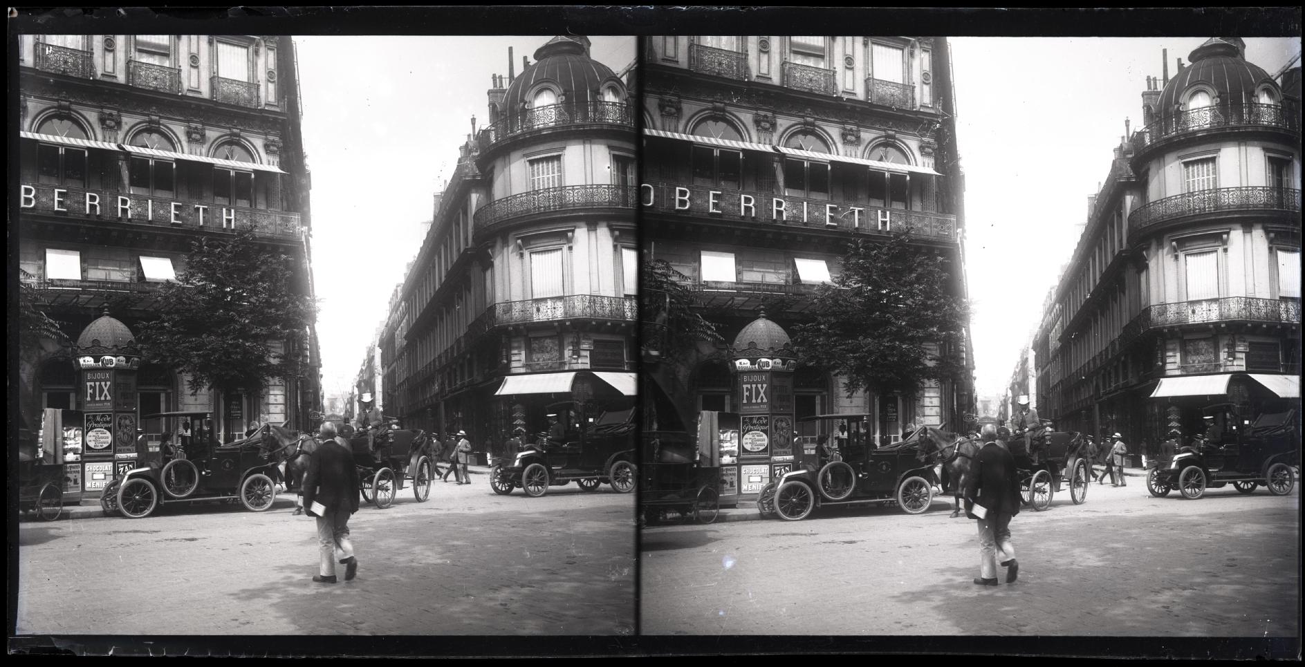Vista parcial del boulevard de los Italianos en París, tomada desde el sur. En primer término, un hombre cruzando la calle y, detrás, 2 automóviles y un carruaje tirado por un caballo. En segundo plano, la calle Laffitte y, al fondo, la iglesia de Nuestra Señora de Loreto.