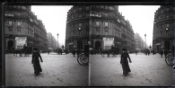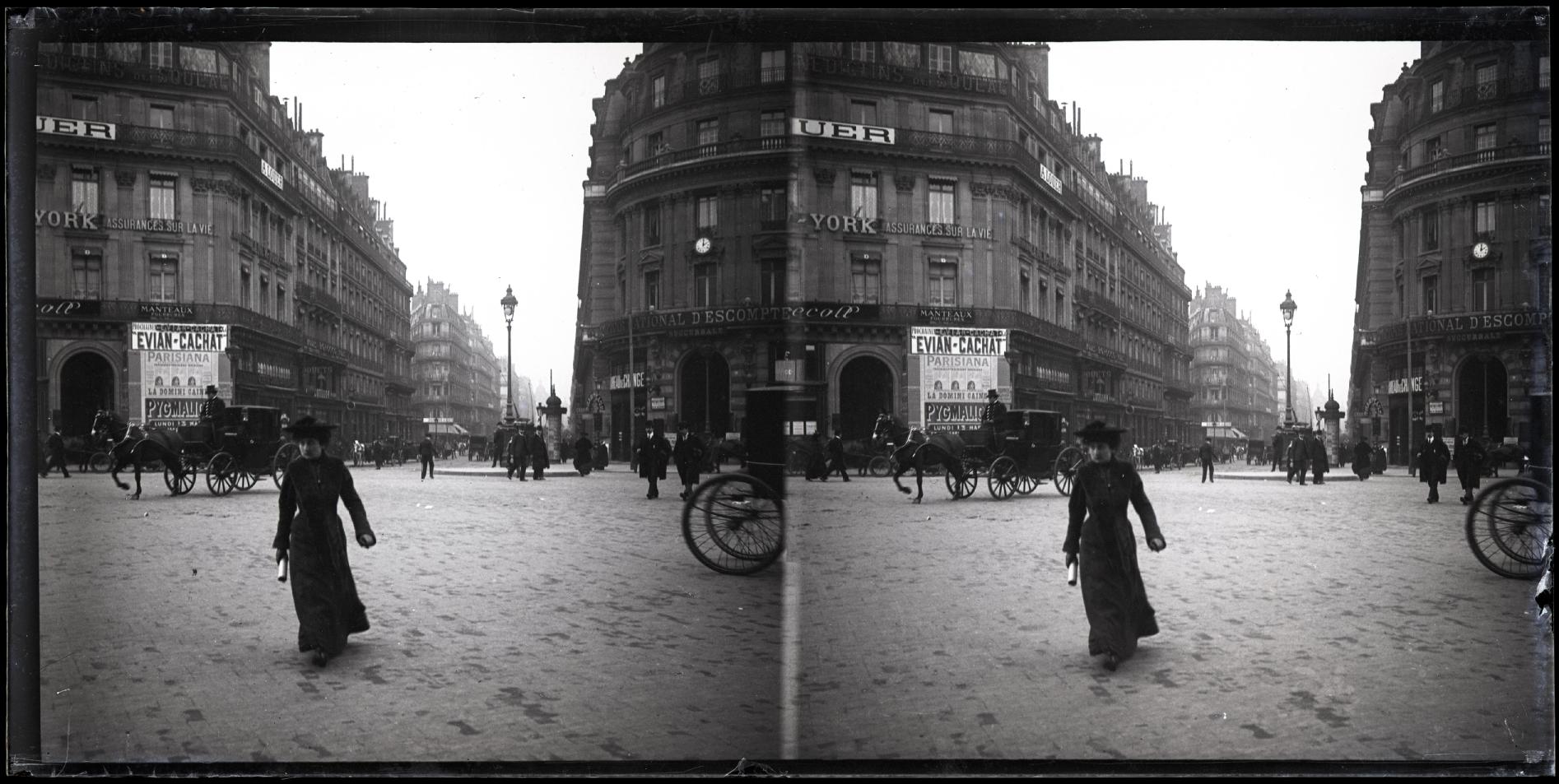Vista de la calle 4 de Septiembre de París, tomada desde la plaza de la Ópera. En primer término, una mujer andando por la calzada. En segundo plano, las fachadas de los edificios de la avenida de la Ópera. En el de la izquierda se leen los carteles: "SOULAG", "ASSURANCES SUR LA VIE", "MANTEAUX", "EVIAN CACHAT". En el de la derecha: "COMPTOIRE NATIONAL DESCOMPTS", "BOUREAU DE CHANGE".