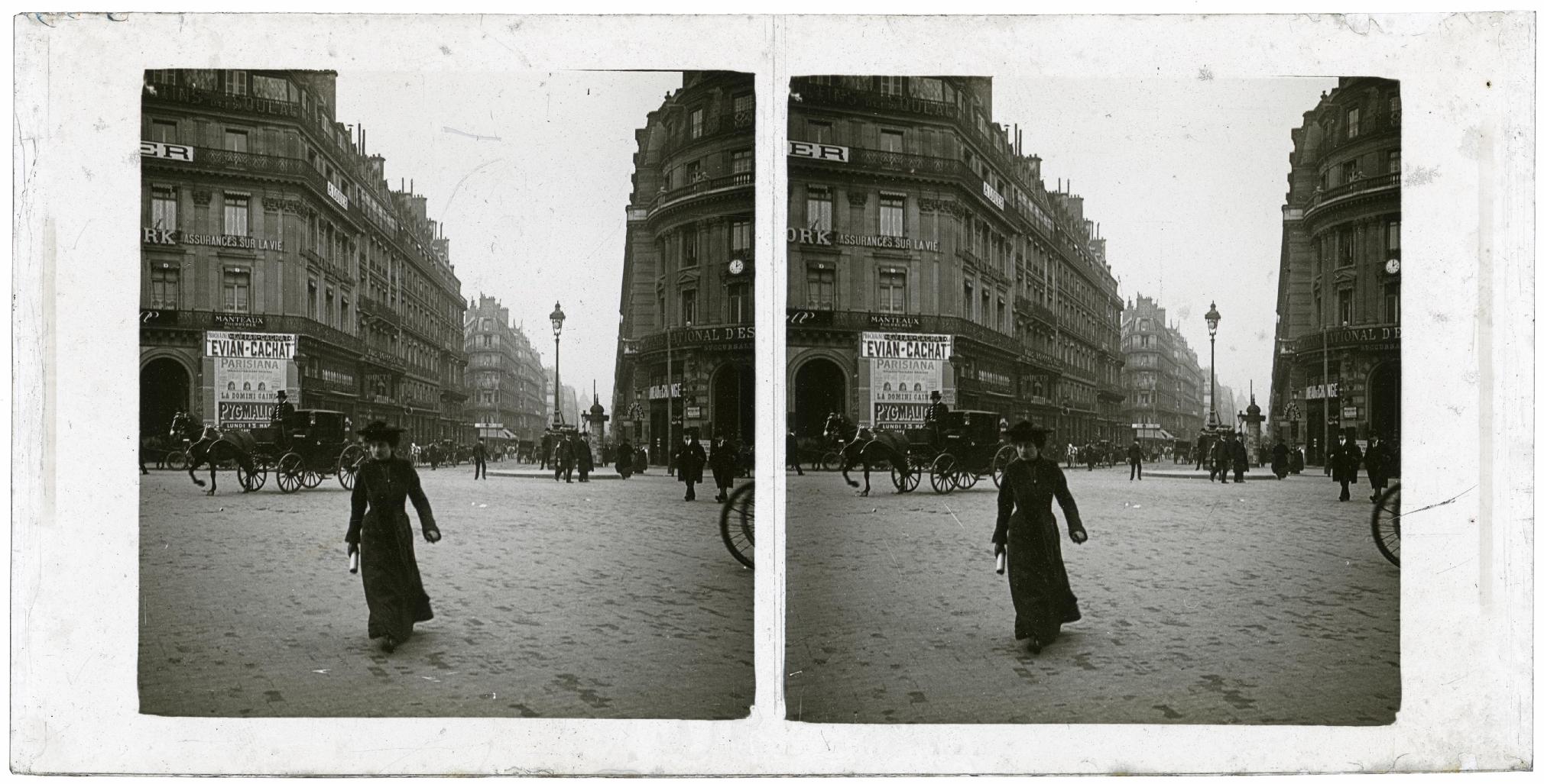 Vista de la calle 4 de Septiembre de París, tomada desde la plaza de la Ópera. En primer término, una mujer andando por la calzada. En segundo plano, las fachadas de los edificios de la avenida de la Ópera. En el de la izquierda se leen los carteles: "SOULAG", "ASSURANCES SUR LA VIE", "MANTEAUX", "EVIAN CACHAT". En el de la derecha: "COMPTOIRE NATIONAL DESCOMPTS", "BOUREAU DE CHANGE".