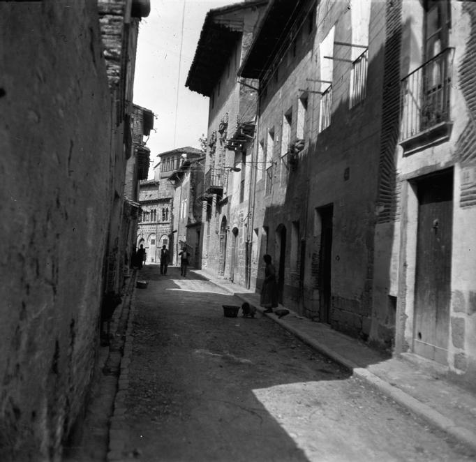 Vista de la calle de la Rúa de la ciudad de Estella, Navarra, tomada desde el este en actual número 13. En segundo plano, en la derecha, el palacio renacentista de San Cristóbal o casa de Fray Diego. Al fondo, el palacio románico de los reyes, hoy museo de Gustavo de Maeztu.