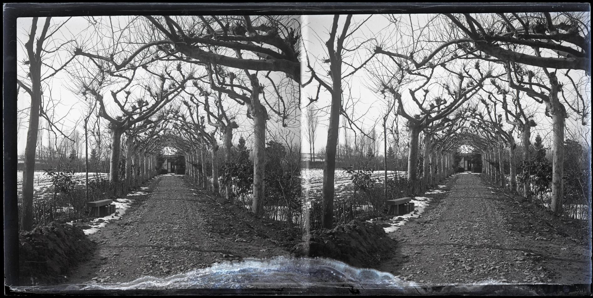• Contenido: Vista de un paisaje nevado del norte de Navarra, de la zona de Bertizarana o Baztán, con un camino con sendas hileras de plátanos y, al fondo, la puerta de un edificio.