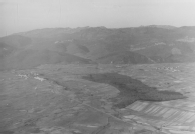 Vista parcial del corredor de la Barranca, tomada desde el mirador del puerto de Lizarraga, en la carretera Estella - Beasáin (actual NA-120), hacia el norte. En primer término, la carretera Estella - Beasáin (Guipúzcoa) (actual NA-120) atraviesa los campos de cultivo del valle de Erogoyena. Más atrás, los centros urbanos de Huarte Araquil, a la izquierda, y Arbizu, a la derecha. Al fondo, la sierra de Aralar.