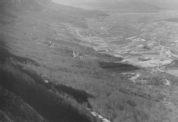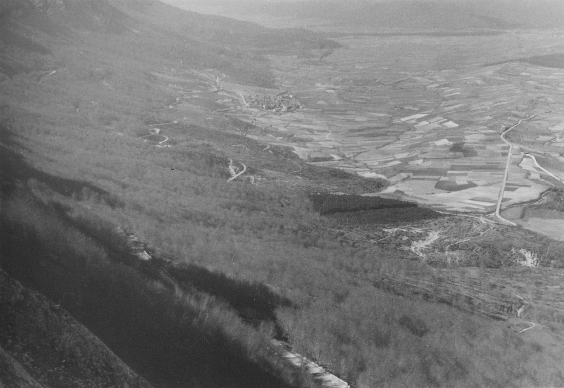 Vista parcial del corredor de la Barranca, tomada desde el mirador del puerto de Lizarraga, en la carretera Estella - Beasáin (actual NA-120). En primer término, ladera norte de la sierra de Urbasa y, a sus pies, el núcleo urbano de Lizarraga y el valle de Ergoyena.