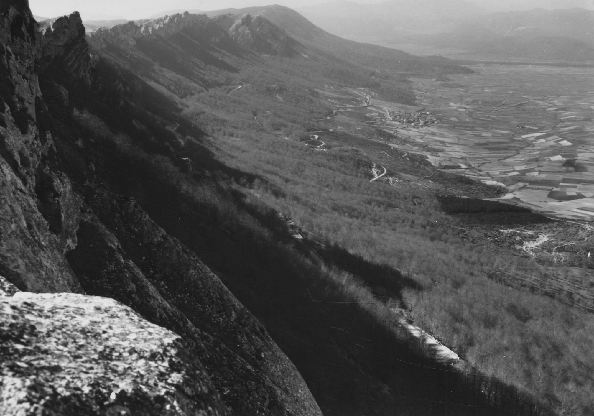 Vista parcial del corredor de la Barranca, tomada desde el mirador del puerto de Lizarraga, en la carretera Estella - Beasáin (actual NA-120). A la izquierda, pared rocosa de la cara norte de la sierra de Urbasa. A la derecha, bajo ella, los valles de Ergoyena y, al fondo, la Burunda.