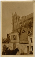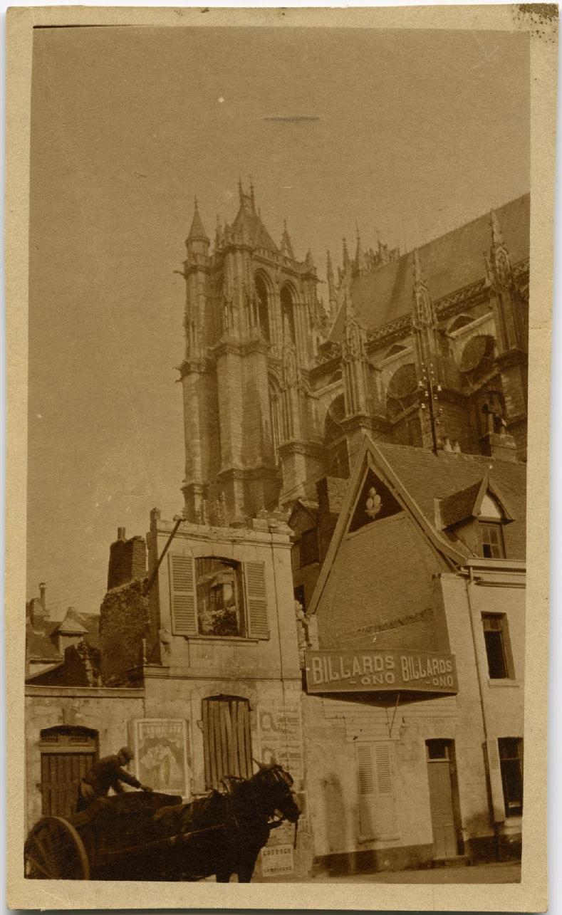 Vista de la fachada sur de la catedral de Notre - Dame de Amiens, departamento de Somme en Francia, tomada desde el sur en la calle de Robert de Luzarches. En primer término, un carro tirado por un caballo y las fachadas de las casas de la calle Robert de Luzarches, en las que se lee el cartel: BILLARS - ONO.