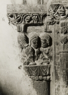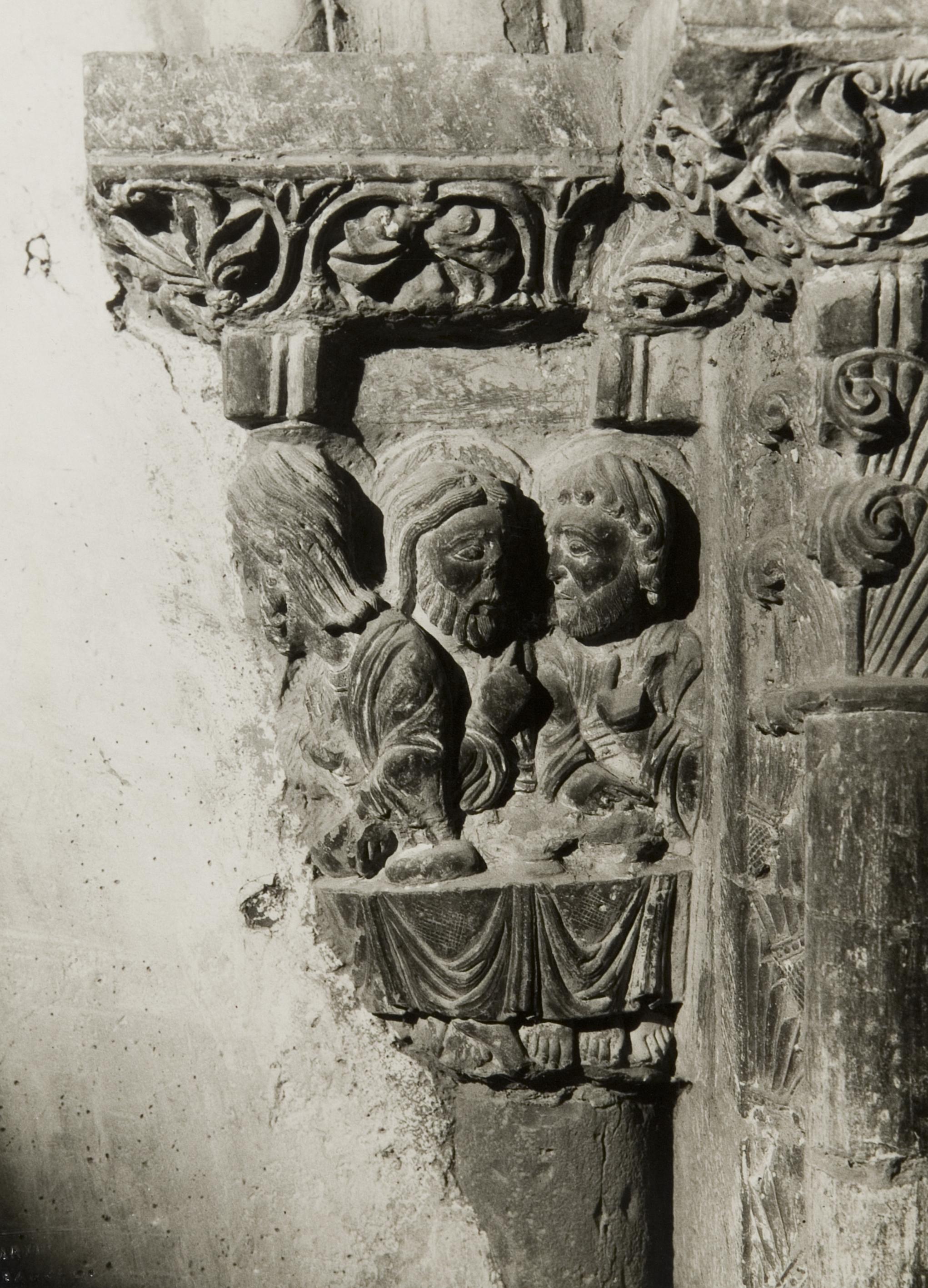 Vista de la cara este del capitel de la Última Cena, situado en el lado sur del pilar noreste del claustro de la catedral de Santa María de Tudela, parcialmente embebido en el muro antes de la restauración del claustro.