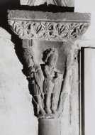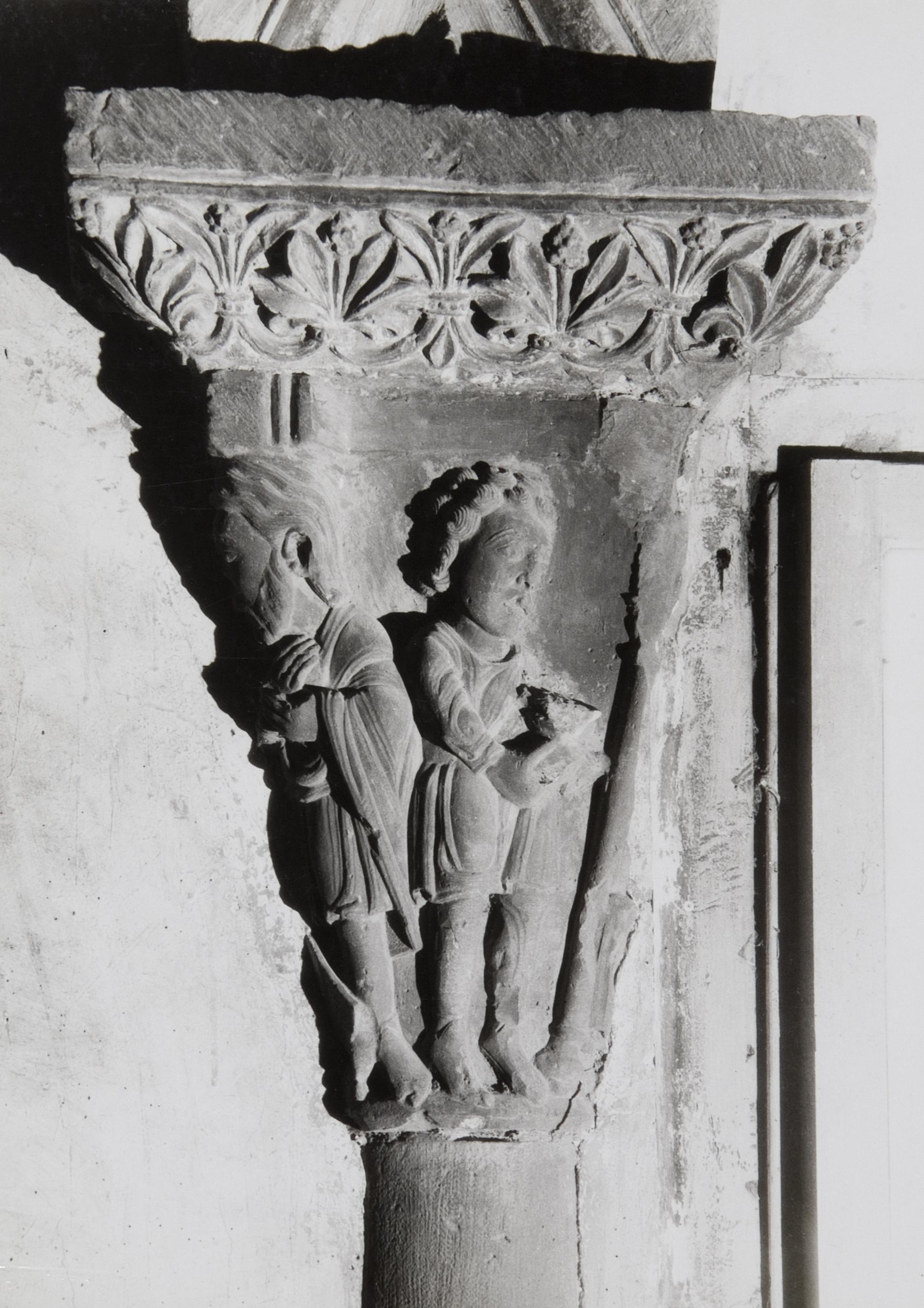 Vista de la cara norte del capitel de la conversión de San Pablo, situado en la crujía sur del claustro de la catedral de Santa María de Tudela, parcialmente embebido en el muro antes de la restauración del claustro.