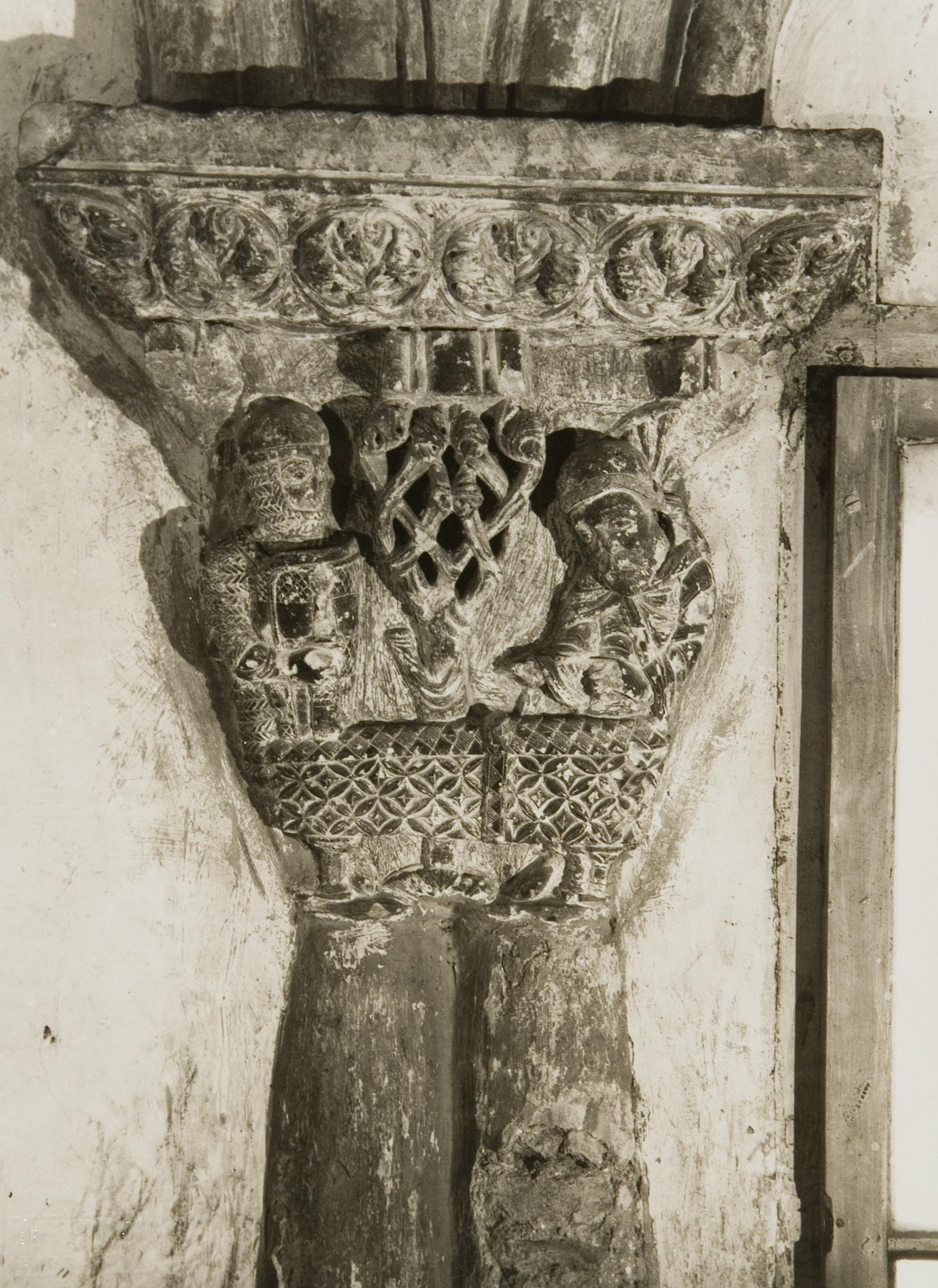 Vista de la cara este del capitel de la custodia del sepulcro de Cristo, situado en la crujía este del claustro de la catedral de Santa María de Tudela, parcialmente embebido en el muro antes de la restauración del claustro.