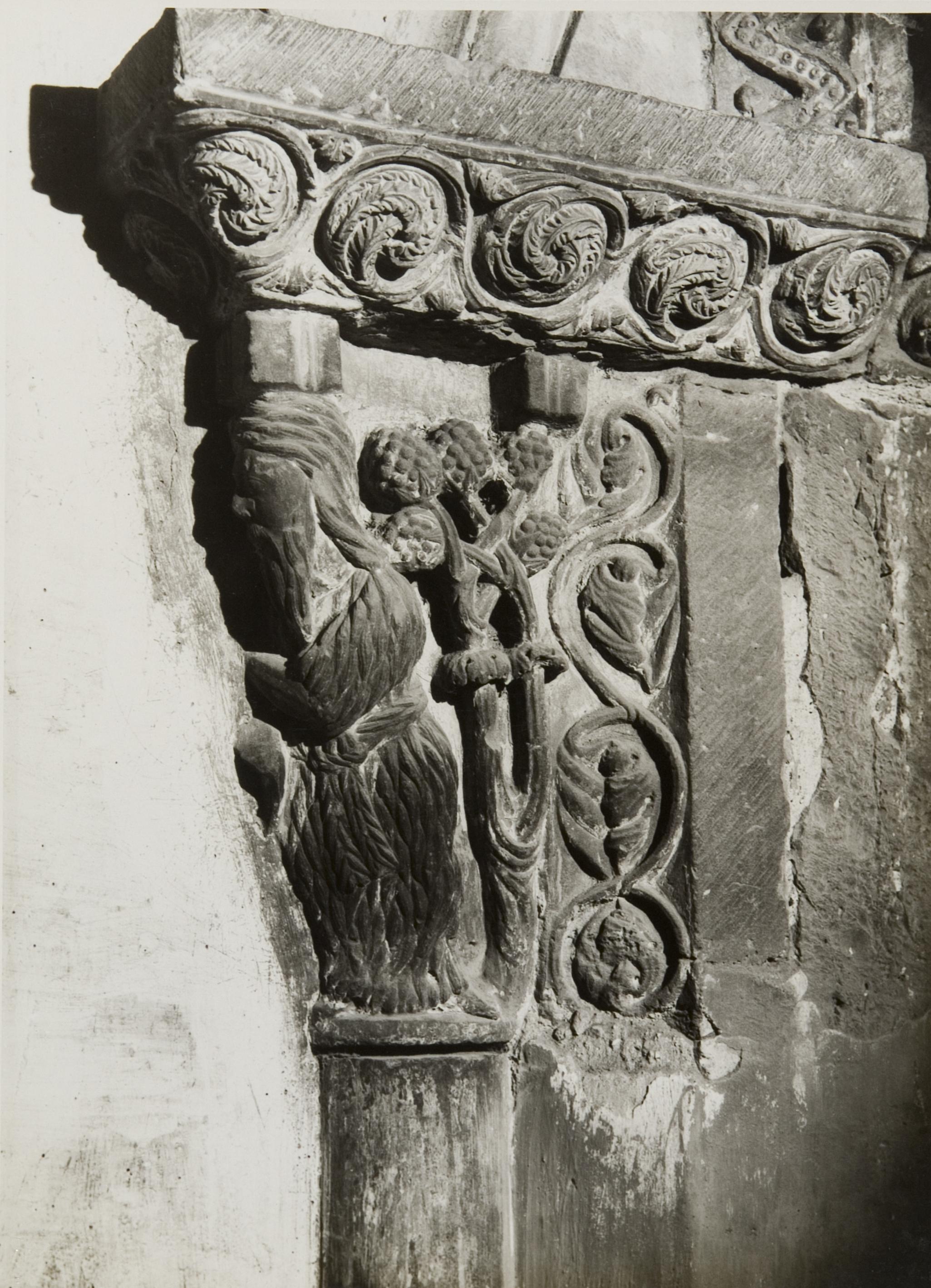 Vista de la cara norte del capitel de la predicación de San Juan Bautista, situado en la crujía norte del claustro de la catedral de Santa María de Tudela, parcialmente embebido en el muro antes de la restauración del claustro.
