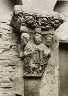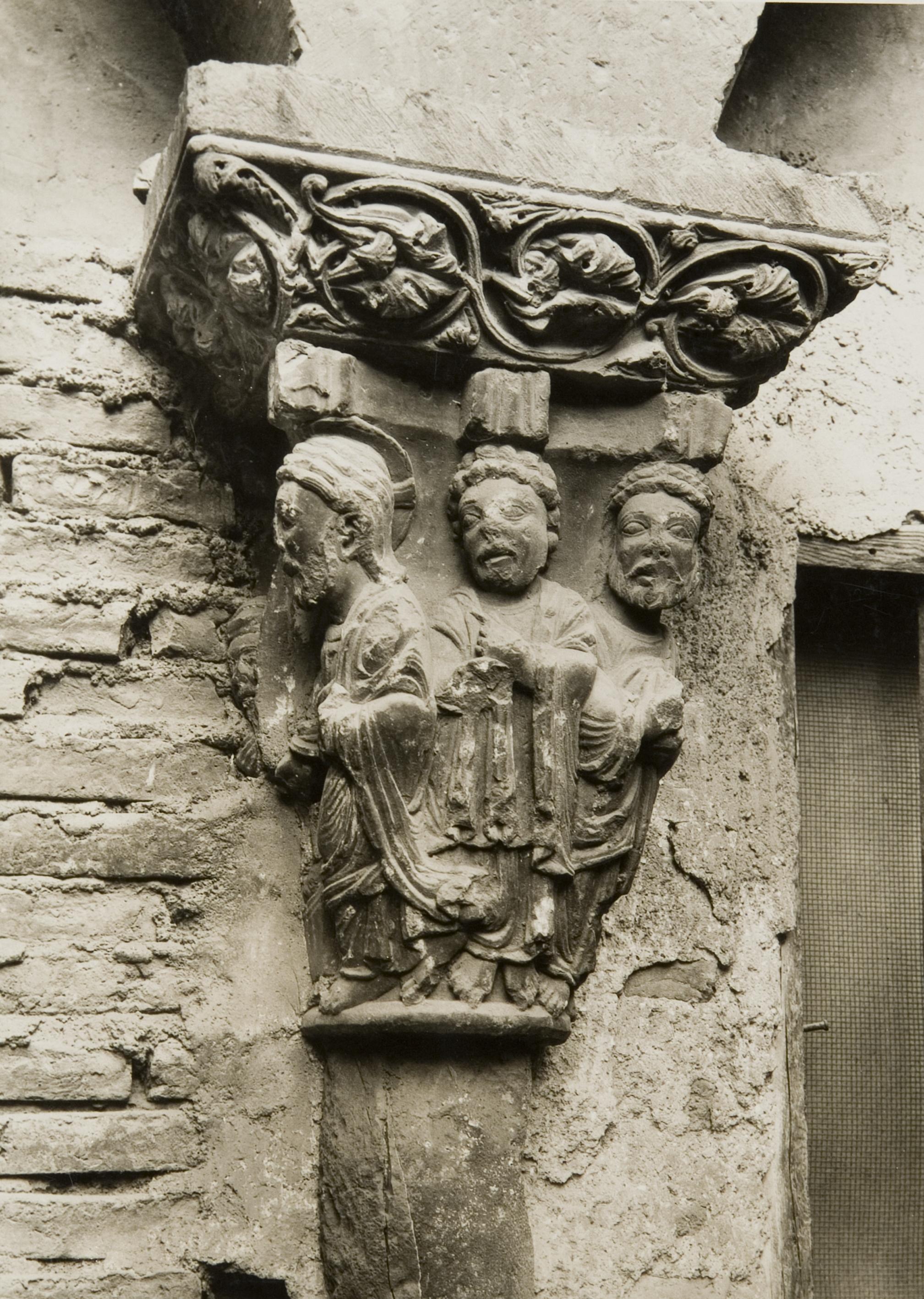 Vista de la cara sur del capitel de la resurrección de Lárazo, con representación de Cristo seguido por los apóstoles, situado en la crujía norte del claustro de la catedral de Santa María de Tudela, parcialmente embebido en el muro antes de la restauración del claustro.