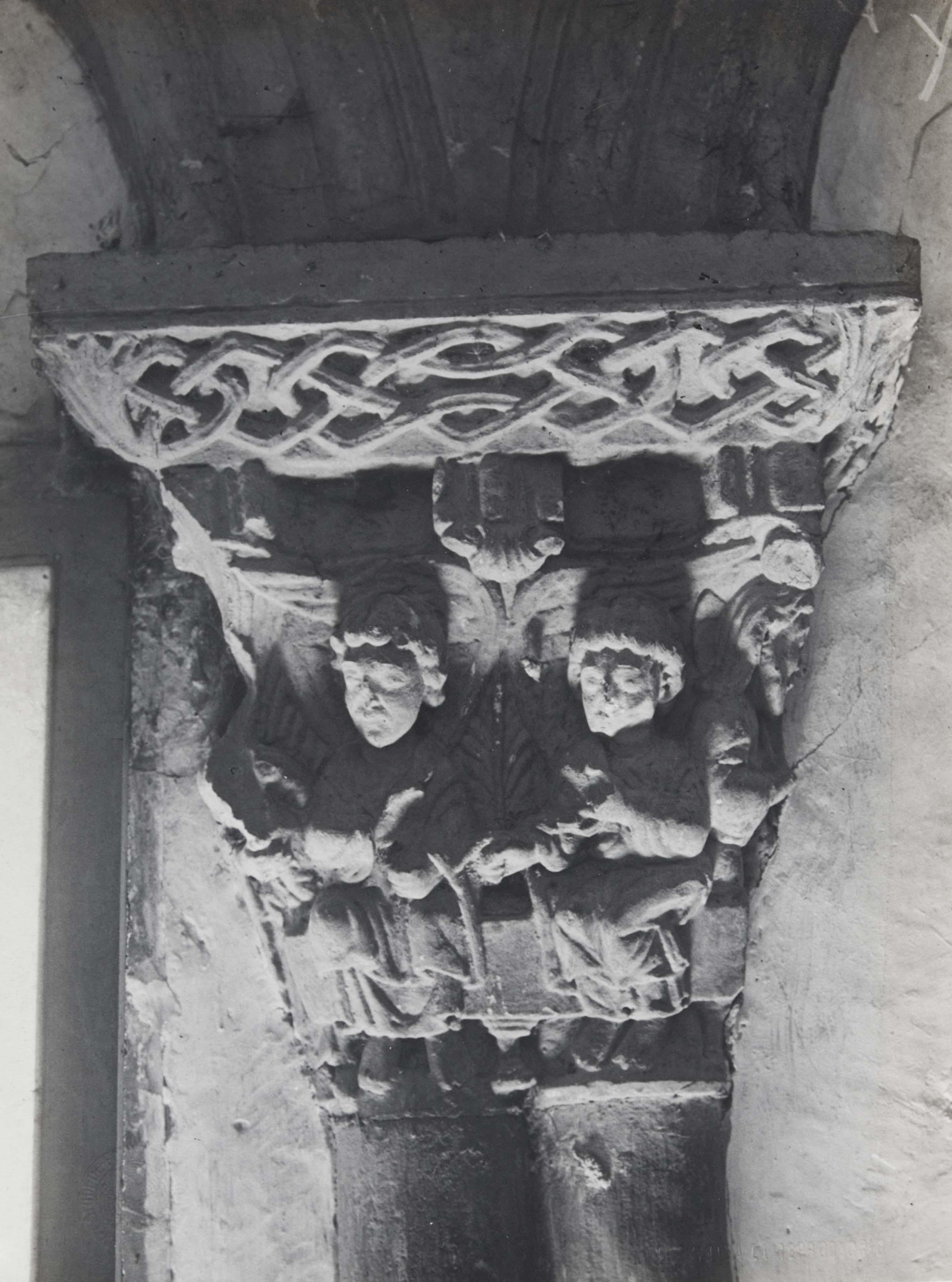 Vista del capitel de las apariciones de Cristo Resucitado, con representación de 2 ángeles sentados sobre el sepulcro vacío, situado en la crujía este del claustro de la catedral de Santa María de Tudela, parcialmente embebido en el muro antes de la restauración del claustro.