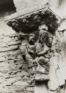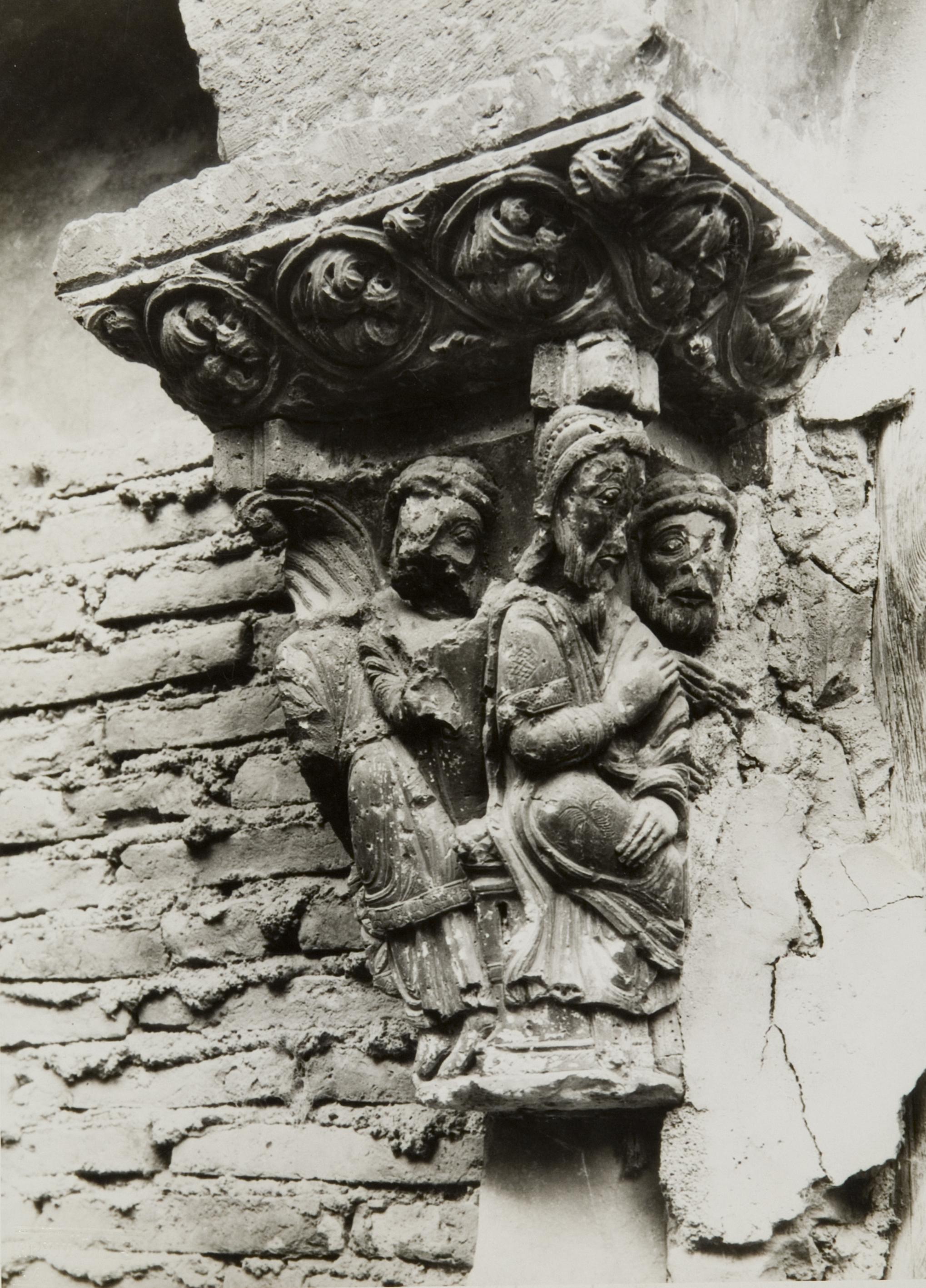 Vista de la cara este del capitel del entierro de Cristo, situado en la crujía este del claustro de la catedral de Santa María de Tudela, parcialmente embebido en el muro antes de la restauración del claustro.