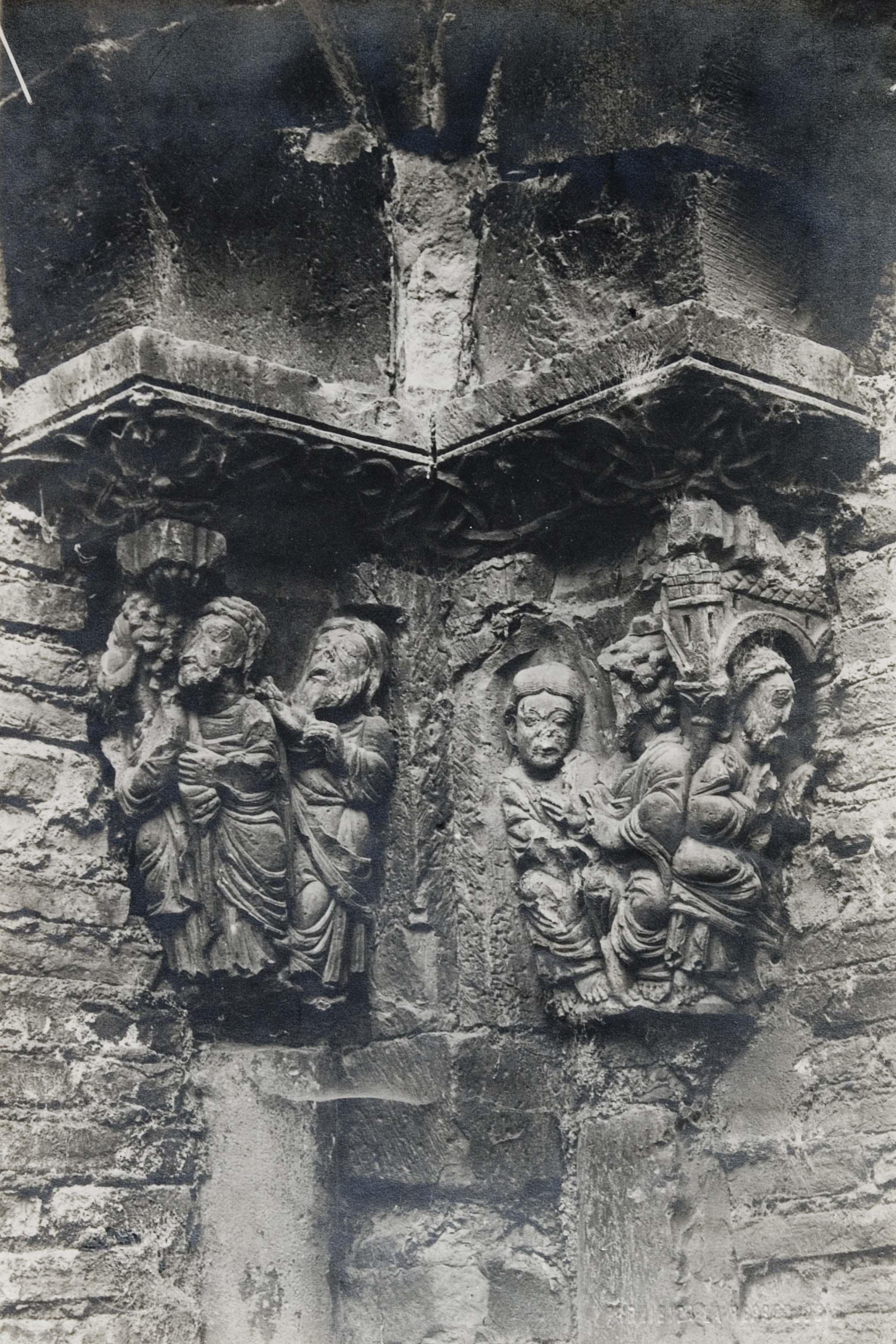 En el anverso, ángulo inferior izquierdo, sello seco del "ESTUDI DE FOTOGRAFIA MAS. BARCELONA". Fotografía instalada sobre soporte secundario encuadernado (tomo 23). En el reverso, ficha impresa del "Museo Iconográfico del Reino" promovido por la Diputación Foral, con anotaciones manuscritas de localización ("Tudela"). La ejecución de las esculturas del claustro catedralicio se han fechado entre 1280 y 1200.