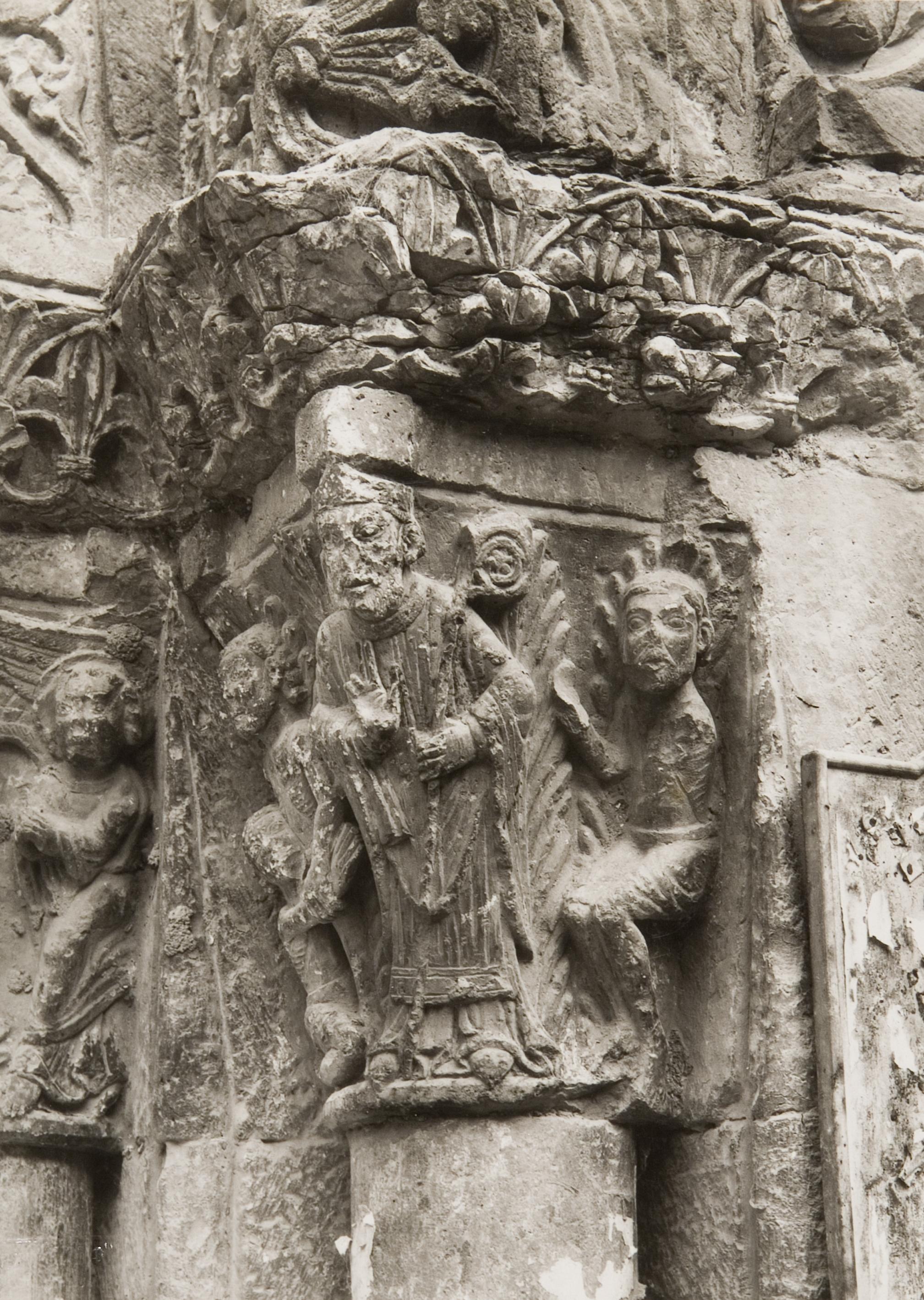 Detalle de la portada del brazo norte del transepto o puerta de Santa María de la iglesia catedral de Santa María de Tudela, con vista del capitel de la columna exterior del derrame de la jamba derecha, con representación de San Martín de Tours realizando un milagro.