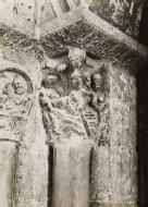 Detalle de la portada del brazo sur del transepto o puerta de la Virgen o del Portal de la iglesia catedral de Santa María de Tudela, con vista del capitel de la columna interior del derrame de la jamba izquierda, con representación de San Pedro caminando sobre las aguas.