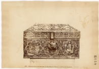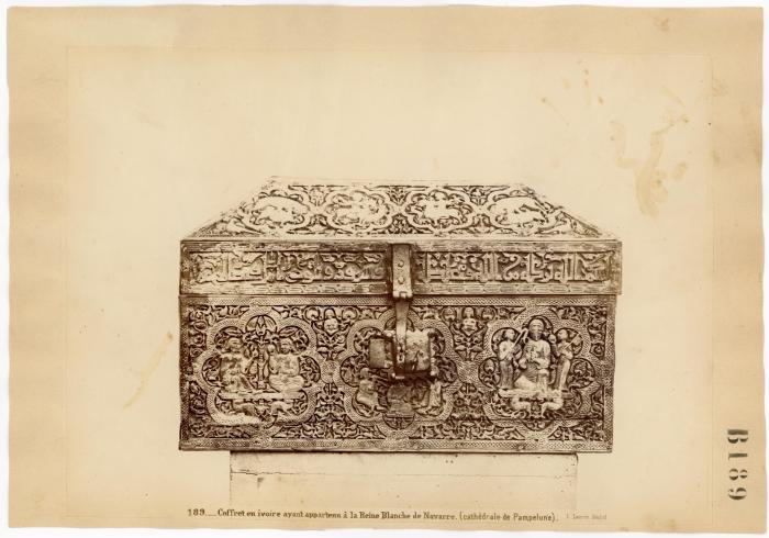 Catedral de Santa María la Real de Pamplona. Arqueta hispano-musulmana procedente del monasterio de Leire, frente. "189. Coffret en ivoire avant appartenu à a Reine Blanche de Navarre. (cathédrale de Pampelune)"