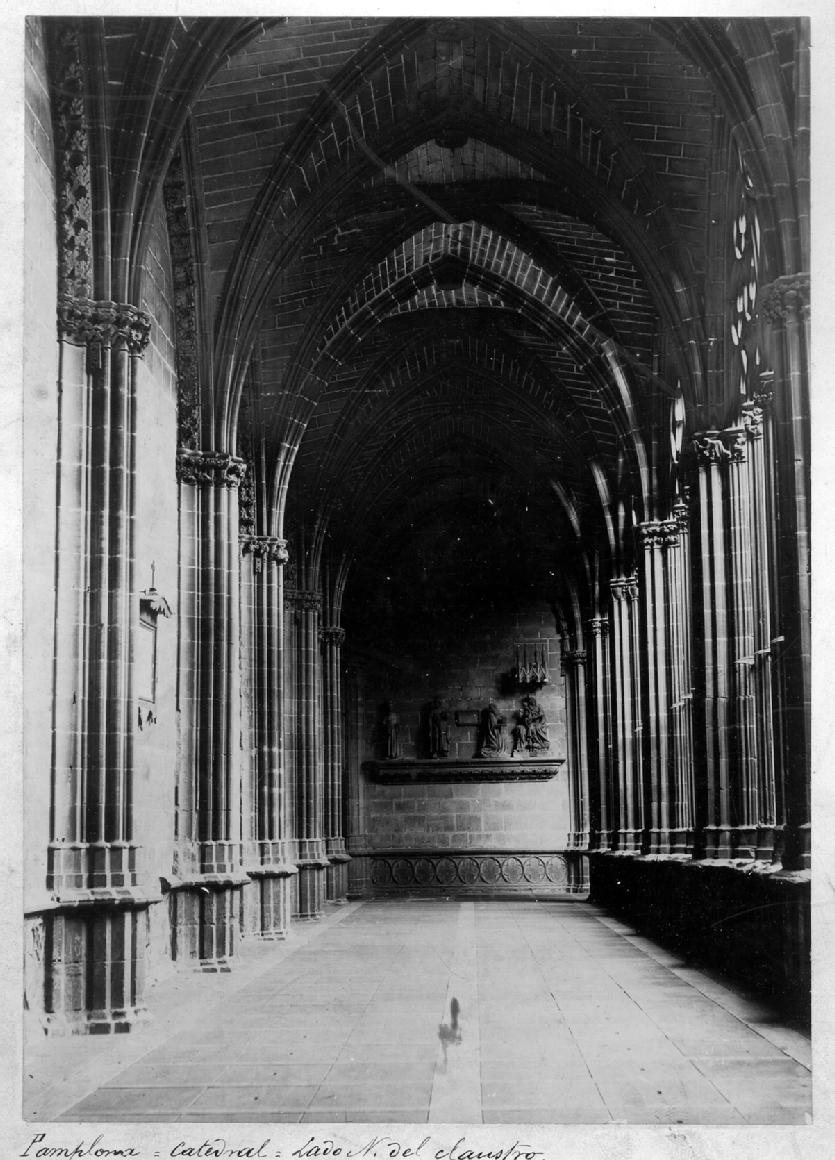Fotografía instalada sobre soporte secundario (27,8x21,5 cm) con leyenda manuscrita inferior: "Pamplona = Catedral = Lado N[orte] del claustro". Forma parte de un grupo de imágenes adhesivadas sobre soportes con anotaciones manuscritas de la misma mano, que incluye fotografías publicadas por Julio Altadill en 1918. Es positivado del mismo negativo que las imágenes CMHAN_IMG0021, CMHAN_IMG0059 Y CMHAN_IMG0114. La Real Academia de la Historia conserva otro positivado del mismo negativo, recibido en 1890. La construcción de la galería septentrional se extendió a lo largo de la primera y segunda fases constructivas del claustro, datadas en 1280-1320 y 1320-1325 aproximadamente.