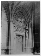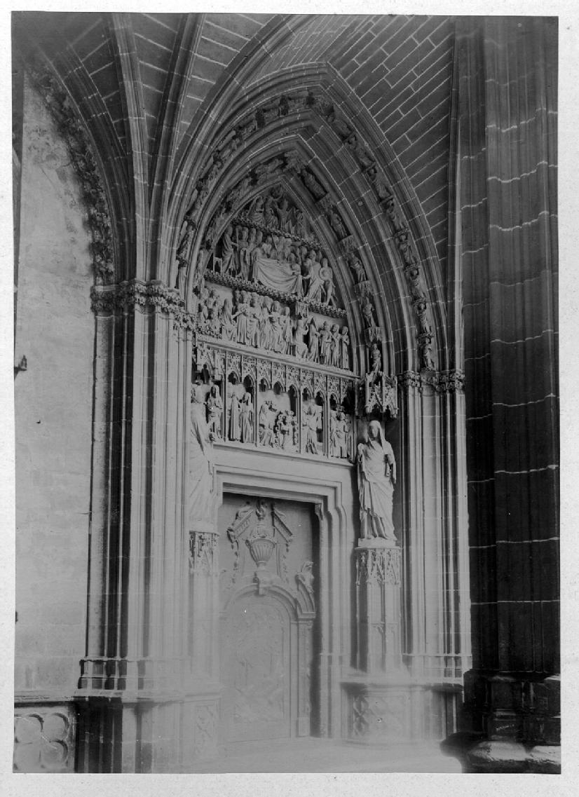 Vista general frontolateral de la puerta Preciosa de la catedral de Santa María la Real de Pamplona, situada en la galería meridional del claustro, tomada desde el ángulo con la galería oriental. En el centro, la portada monumental gótica decorada con escenas del ciclo del Tránsito de la Virgen.