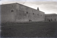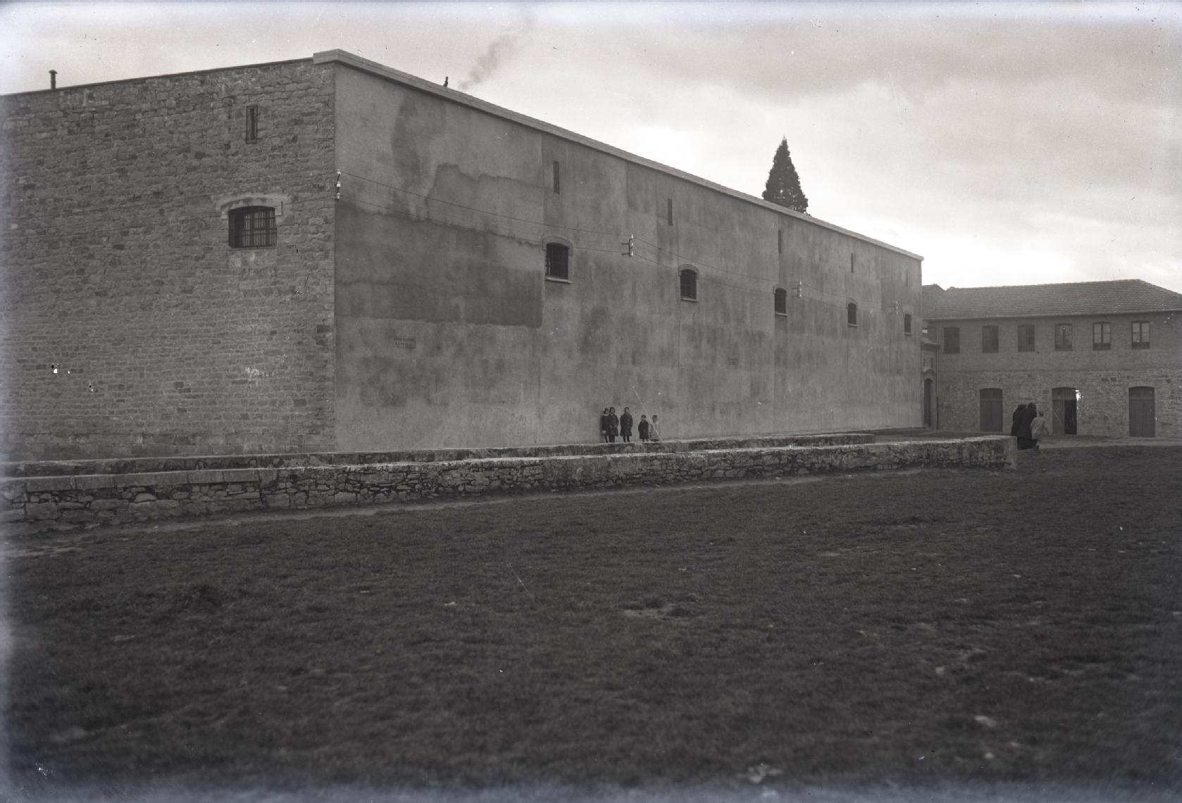 Vista general de la fachada trasera del convento de las Siervas de María en Pamplona, abierta hacia el paseo del Redín. En el centro, muro trasero del convento. A la derecha, puerta al Laboratorio Provincial.