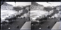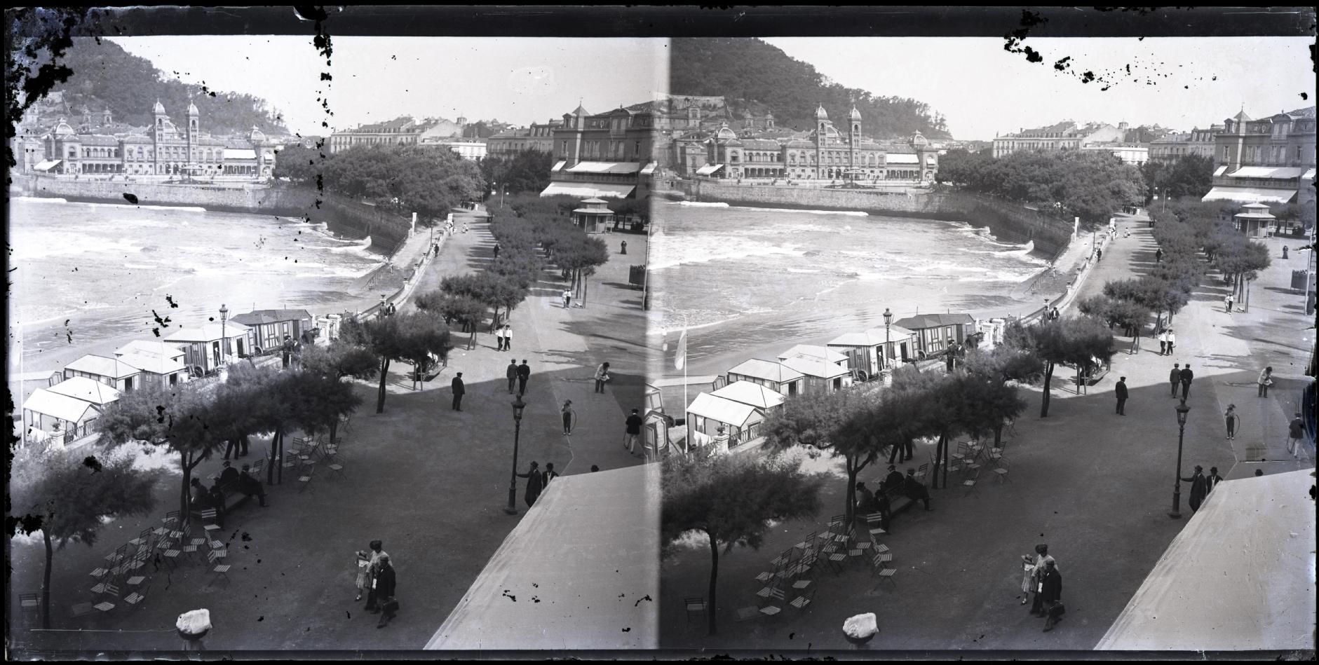 Vista del paseo de La Concha en la ciudad de San Sebastián, Guipúzcoa, tomada desde el sur. En primer término, personas paseando o sentadas en los bancos del paseo. En segundo plano, las casetas de bañistas en la playa. Detrás, los jardines de Alderdi Eder y, al fondo, el casino, actual casa consistorial.