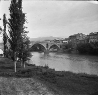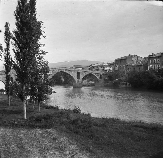 Vista del puente románico de Puente La Reina, Navarra, sobre el río Arga tomada desde la orilla derecha aguas abajo. En primer término, la orilla con los chopos y el cauce del río. En segundo plano, el puente y las casas del núcleo urbano, entre ellas la casa del Vínculo.