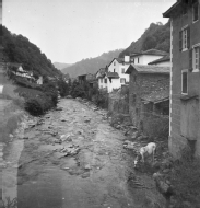 Vista del río La Nive d'Arnéguy a su paso por la localidad de Arnéguy, región de Nueva Aquitania, Francia, tomada desde un puente hacia el noreste.